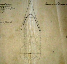 Projecções ortogonais de um cone recto cuja base é paralela ao plano horizontal e a verdadeira grandeza da acção feita por um plano perpendicular ao plano horizontal.