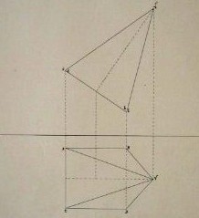 Projecções ortogonais duma pirâmide recta quadrada inclinada aos dois planos de projecção