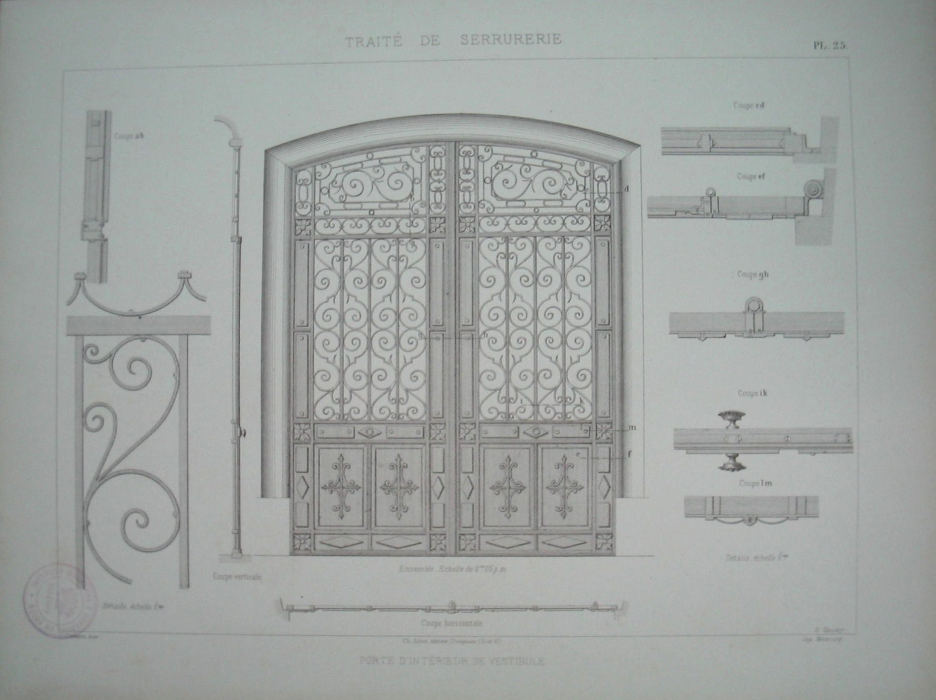 | Descrição: | Estampa PL.25, pertencente à colecção: "Traité de Serrurerie". A obra completa forma um atlas com 112 estampas. A estampa representa uma porta com uma grade em ferro ornamentada com "S's" e "C's", rosetas e volutas. Na parte inferior contém um painel metálico com vários formas geométricas, desde rectângulos, losângulos e ainda rosetas e cruzes. A estampa contém uma figura com o ornamento da grade, assim como algumas figuras de cortes. |