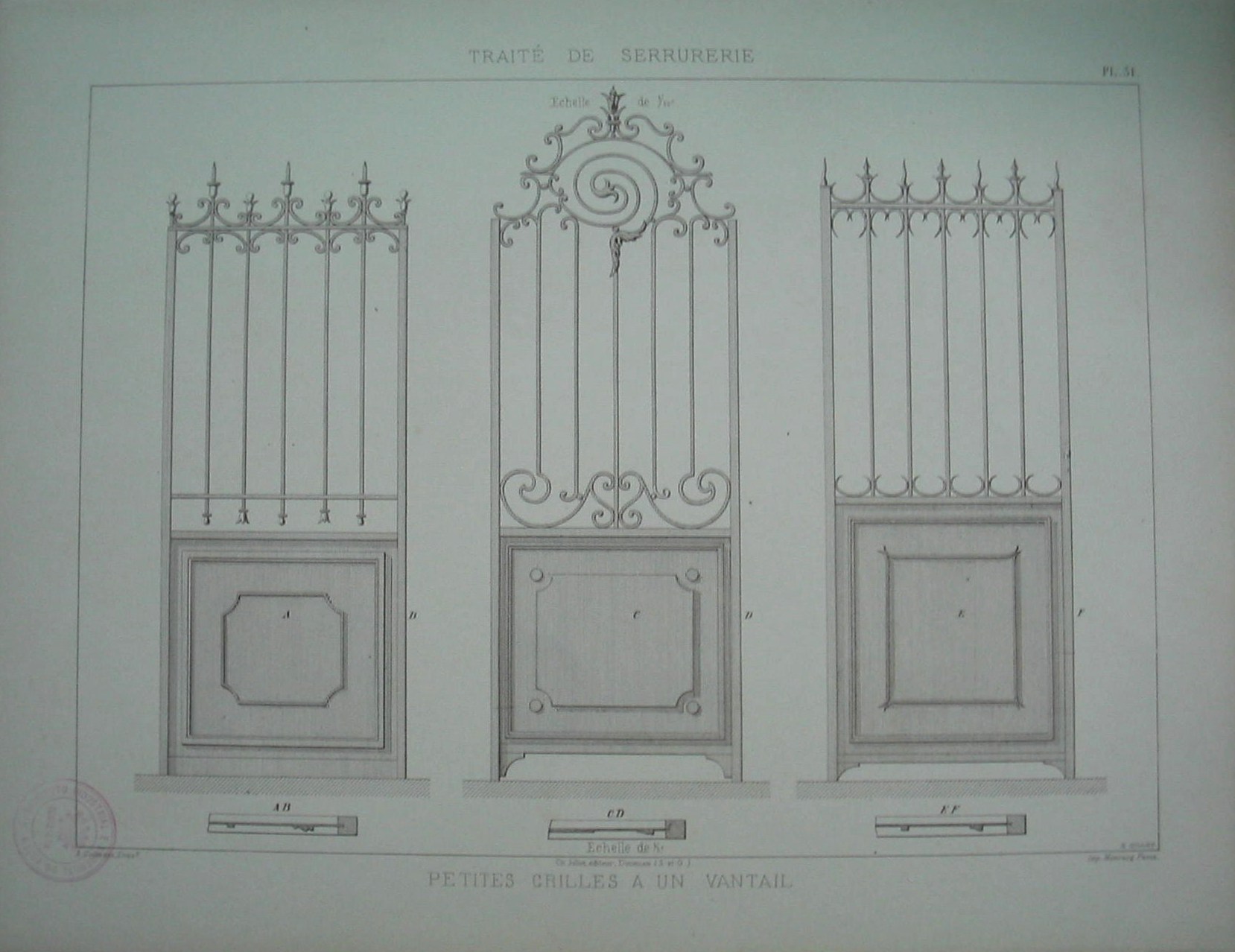 | Descrição: | Estampa PL.31, pertencente à colecção: "Traité de Serrurerie". A obra completa forma um atlas de 112 estampas. A estampa representa três modelos de pequenos portões de uma só folha, que se utiliza para entrada das casas, pavilhão, ou como portas das traseiras que dão passagem para um jardim ou quintal. A largura varia entre 0,75m e 1m e com 2,25 m de altura. Os portões expostos contém, na parte inferior, painéis metálicos com molduras. Sobre estes, existem um gradeamento simples com decoração nas extremidades. As decorações têm a forma de semi-circulos, "S", "C" e volutas. Terminam na extremidade superior, com pontas de lanças, chamas, bolas e flor de lis. |