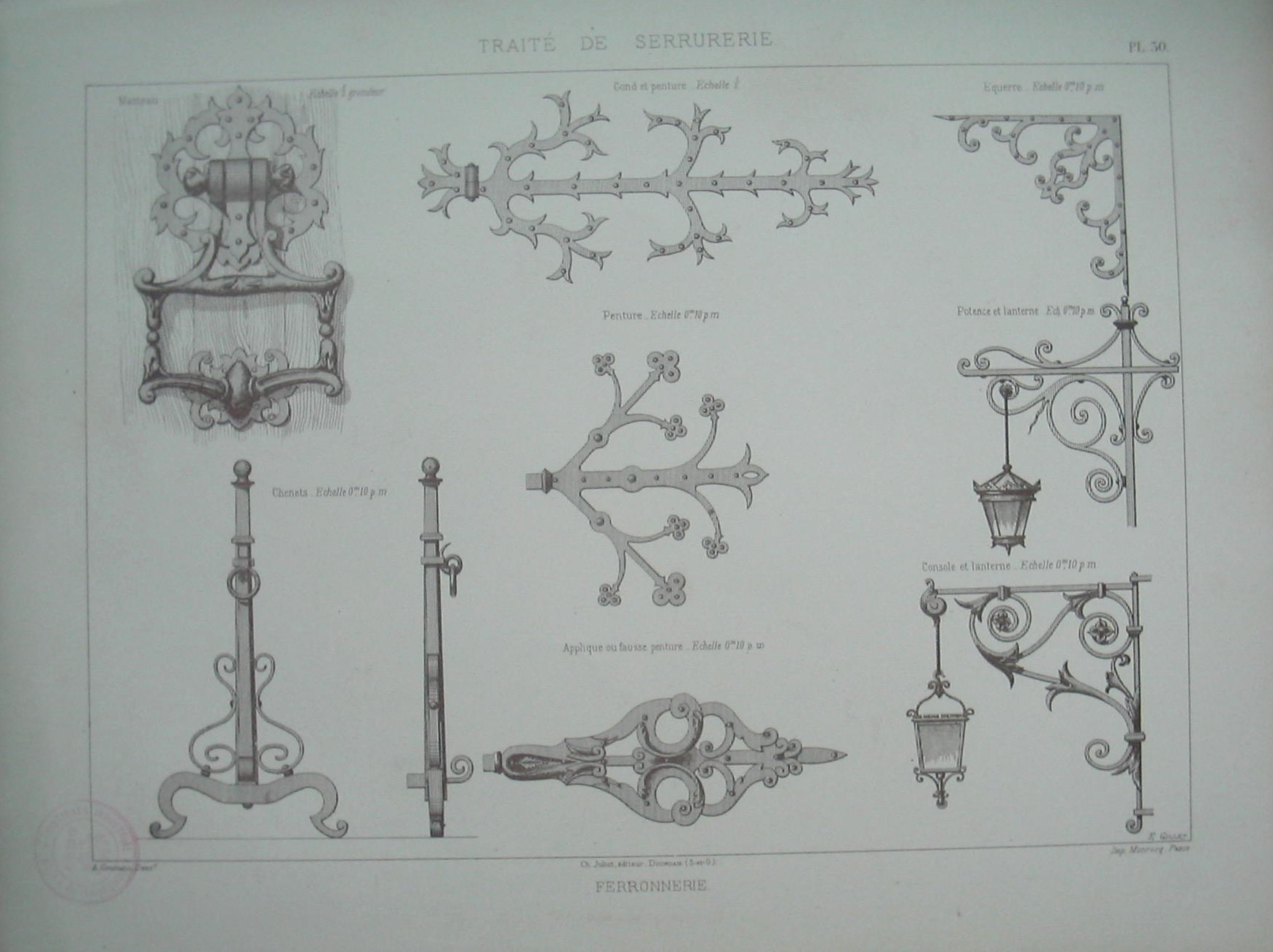 | Descrição: | Estampa PL.30, pertencente à colecção:"Traité de Serrurerie". A obra completa forma um atlas com 112 estampas. A estampa apresenta várias figuras com modelos em ferro para aplicar em serralharia, para dar relevo, embelezar as peças e possuem várias utilizações. São expostos modelos de batentes, dobradiças, pendentes, suportes, consolas, lanternas e apliques. Os acessórios são ornamentados com folhas de acanto, flores, trevos, bolas, linhas ondulatórias e em "S" e volutas. |