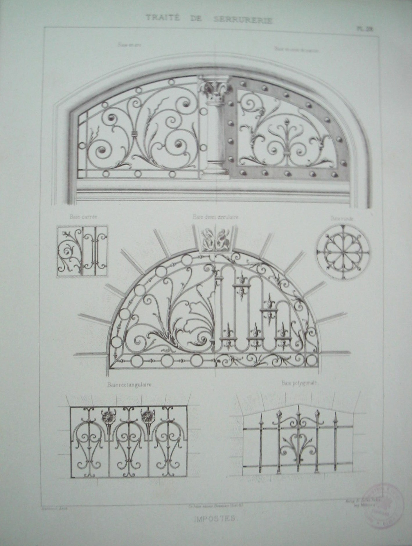 | Descrição: | Estampa PL. 28, pertencente à colecção: "Traité de Serrurerie". A obra completa forma um atlas com 112 estampas. As impostas são paineis em ferro que protegem uma abertura de uma porta, na parte superior, e tem como finalidade a entrada de luminusidade. A estampa representa vários modelos de imagens de impostas com diferentes formas e dimensões. Salienta-se as forma em arco, em quadrado, em rectângulo, semi-circulo, círculo e poligonal. As grades são ornamenttadas com volutas, motivos florais e vegetais, rosetas, circulos, ornamentos em "C" e "S". Algumas terminam com pontas de lança. |