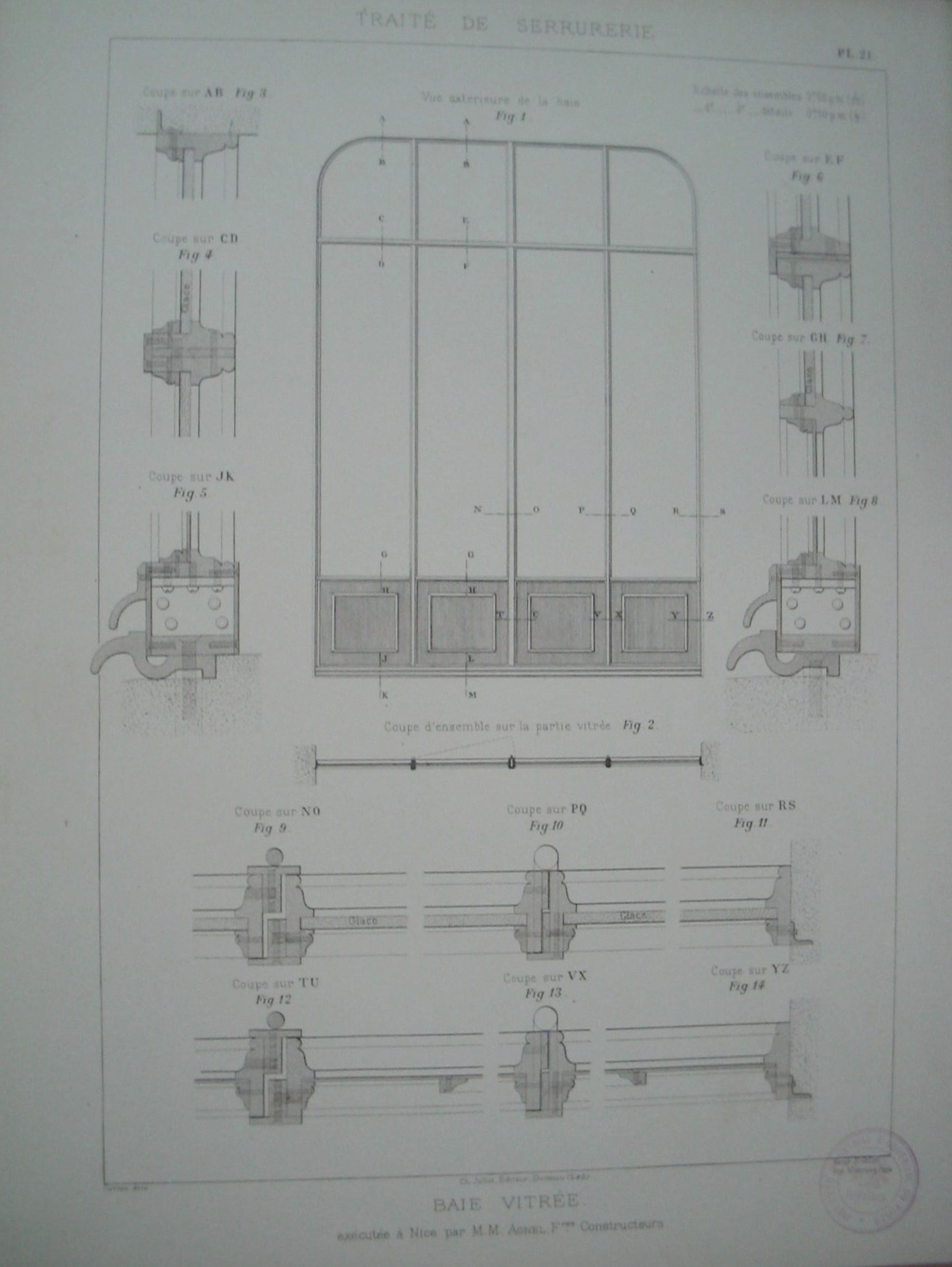 | Descrição: | Estampa PL.21, pertencente à colecção: "Traité de Serrurerie". A obra completa forma um atlas com 112 estampas. A estampa representa um envridaçado com 2,40 m de largura e 3, 35 de altura. É dividido em quatro paineis de 0,60m de largura. Sobre estes painéis contém uma imposta de 0,65 m de altura. A estrutura do envidraçado é composto por ferro em forma de arco. Na parte inferior do envidraçado, e em todo o comprimento, possui um painel com molduras. A estampa possui várias figuras com detalhes da estrutura do envidraçado. Este método de construção com perfis em ferro foi retirado do álbum de M.Mazellet. |