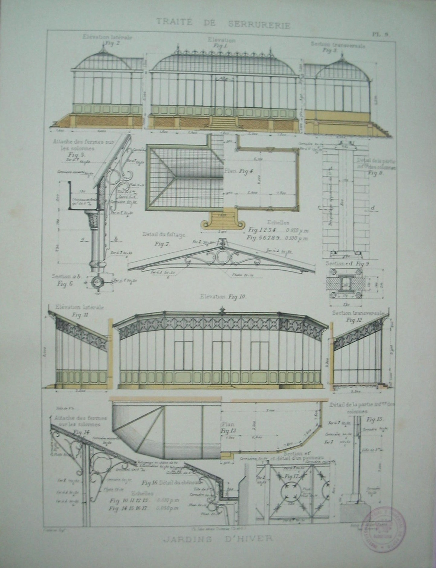 | Descrição: | Estampa PL. 9, pertencente à colecção: "Traité de Serrurerie". A obra completa forma um atlas com 112 estampas. A estampa representa imagens de jardins de inverno e detalhes dos elementos que constituem a construção. Os jardins de inverno eram, geralmente, construidos como anexos às habitações ou isolados. As formas e o modo de construção variam com a disposição dos locais e dependem do gosto do constructor. São construidos em ferro, vidro e zinco. |