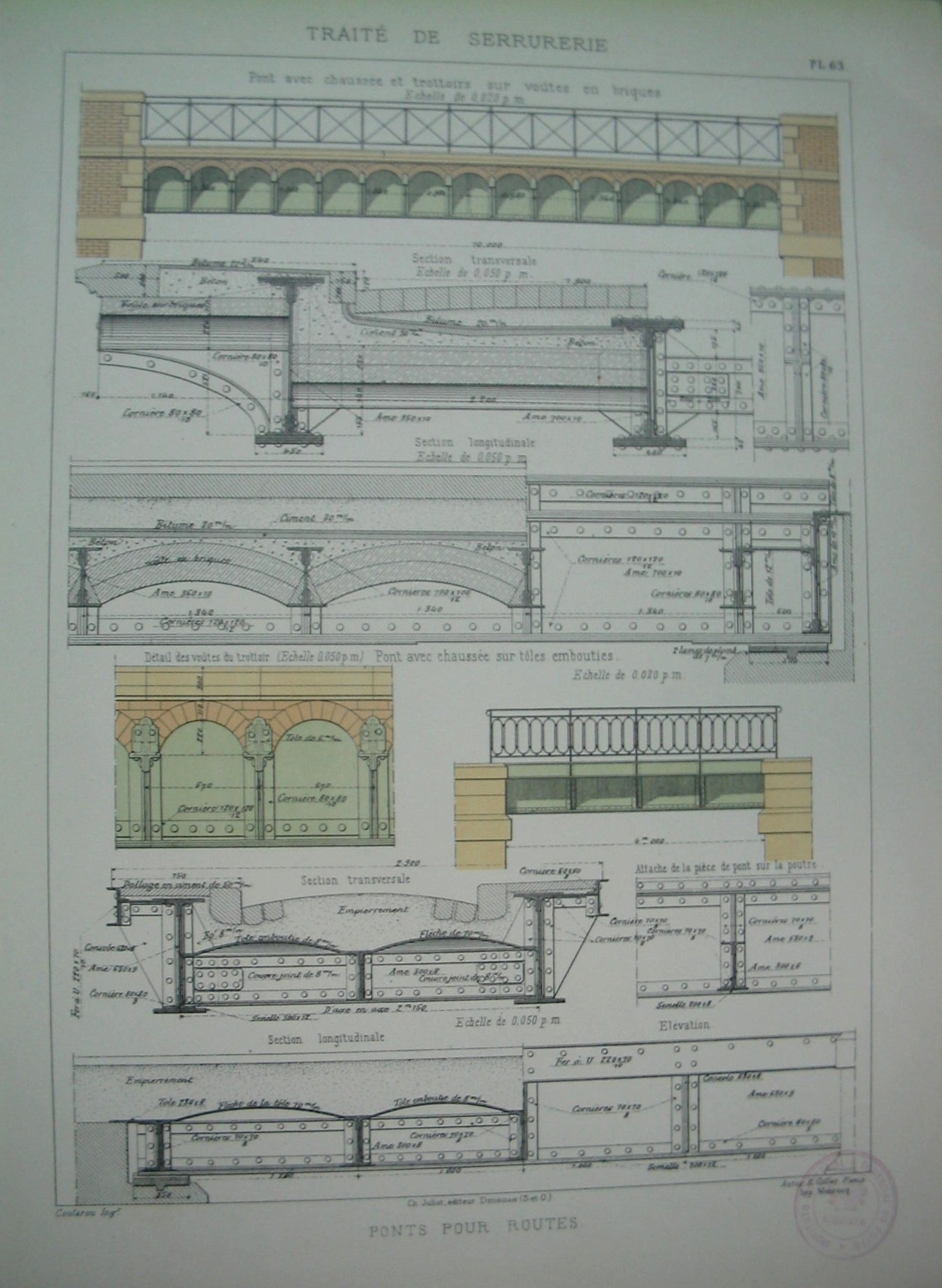 | Descrição: | Estampa PL.63, pertencente à colecção "Traité de Serrurerie". A obra completa forma um atlas com 112 estampas. A estampa apresenta dois exemplos de pontes utilizadas para a passagem de veículos. Os dois modelos de pontes possuem um gradeamento em ferro com formas geométricas (quadrados e elipses). Os modelos de pontes apresentados na estampa são: Ponte com arcos em tijolo e ponte com folhas de metal prensado; O pavimento da ponte com arcos em tijolo é formado por três vigas longitudinais apoiados em arcos de tijolo. As pontes com folhas de metal prensado são utilizadas em estradas rurais. |