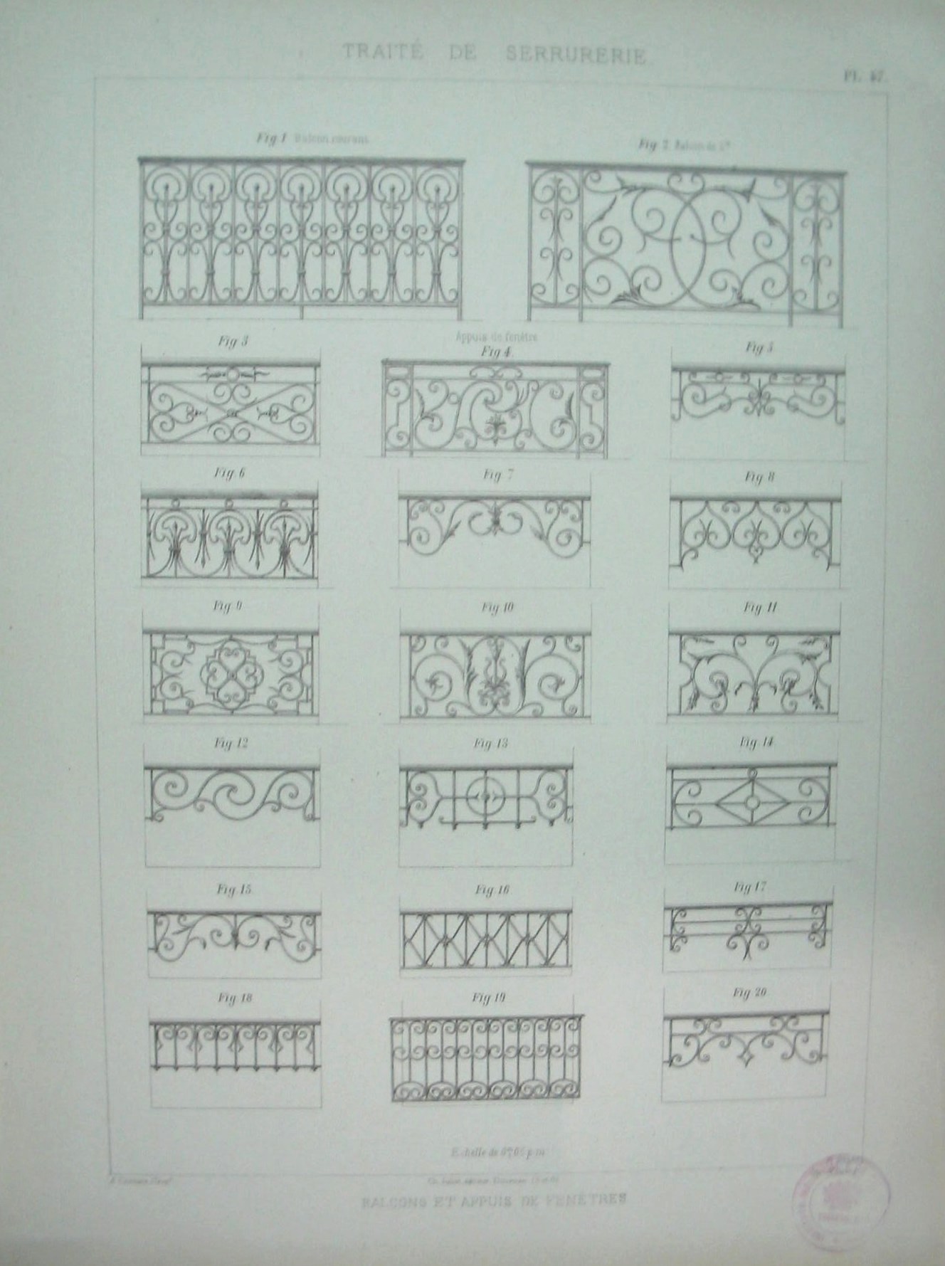 | Descrição: | Estampa PL.47, pertencente à colecção:"Traité de Serrurerie". A obra completa forma um atlas com 112 estampas. A estampa representa vinte figuras, duas das quais são de varandas e as restantes refere-se a peitoris. Estas estruturas são de ferro forjado, ornamentado com motivos ondulados e vegetais (folhas). Possuem um corrimão em madeira na parte superior. Este tipo de construção designam-se por varandas de cruz. Além de servir de apoio e protecção às janelas, têm a funcionalidade de embelezar a fachada do edificio. As figuras estão representadas à escala de 0m,5p.m. |