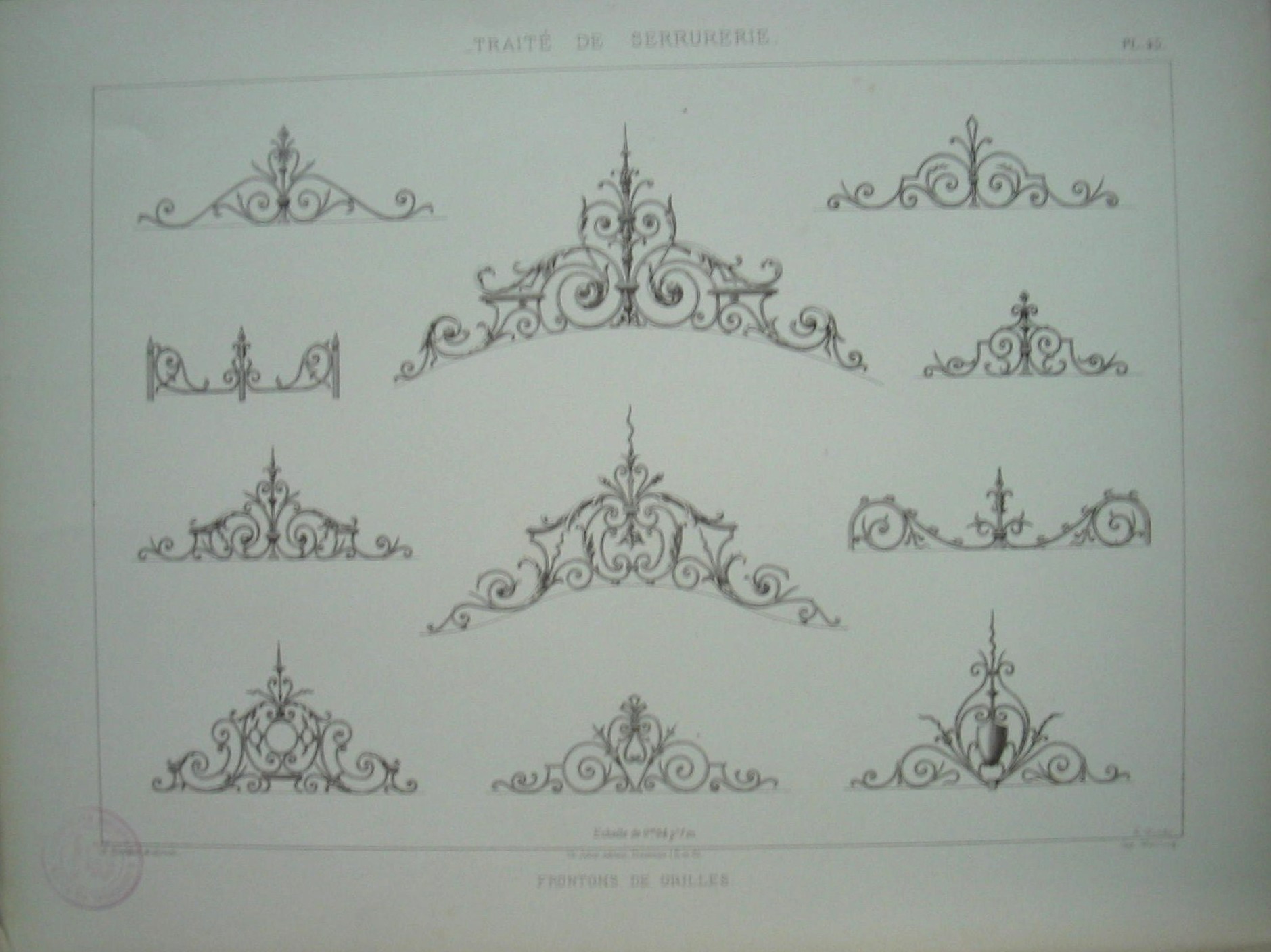 | Descrição: | Estampa PL. 45 pertencente à colecção:"Traité de Serrurerie". A obra completa forma um atlas de 112 estampas. A estampa representa onze figuras com modelos de frontões. Os frontões são a parte essencial na decoração de um portão de grades. Existem dois tipos de frontões: fixos ou moveis (colocados em portões abertos). Os frontões fixos encontram-se sobre um lintel ou um arco. São fixados com pregos ou parafusos. Os frontões colocados em portões abertos são fixados na estrutura do portão. Os frontões possuem decorações variadas, desde linhas onculadas, palmetas, motivos vegetais, entre outros. Terminam com pontas de lança e ponteiros. Os frontões são em ferro. |