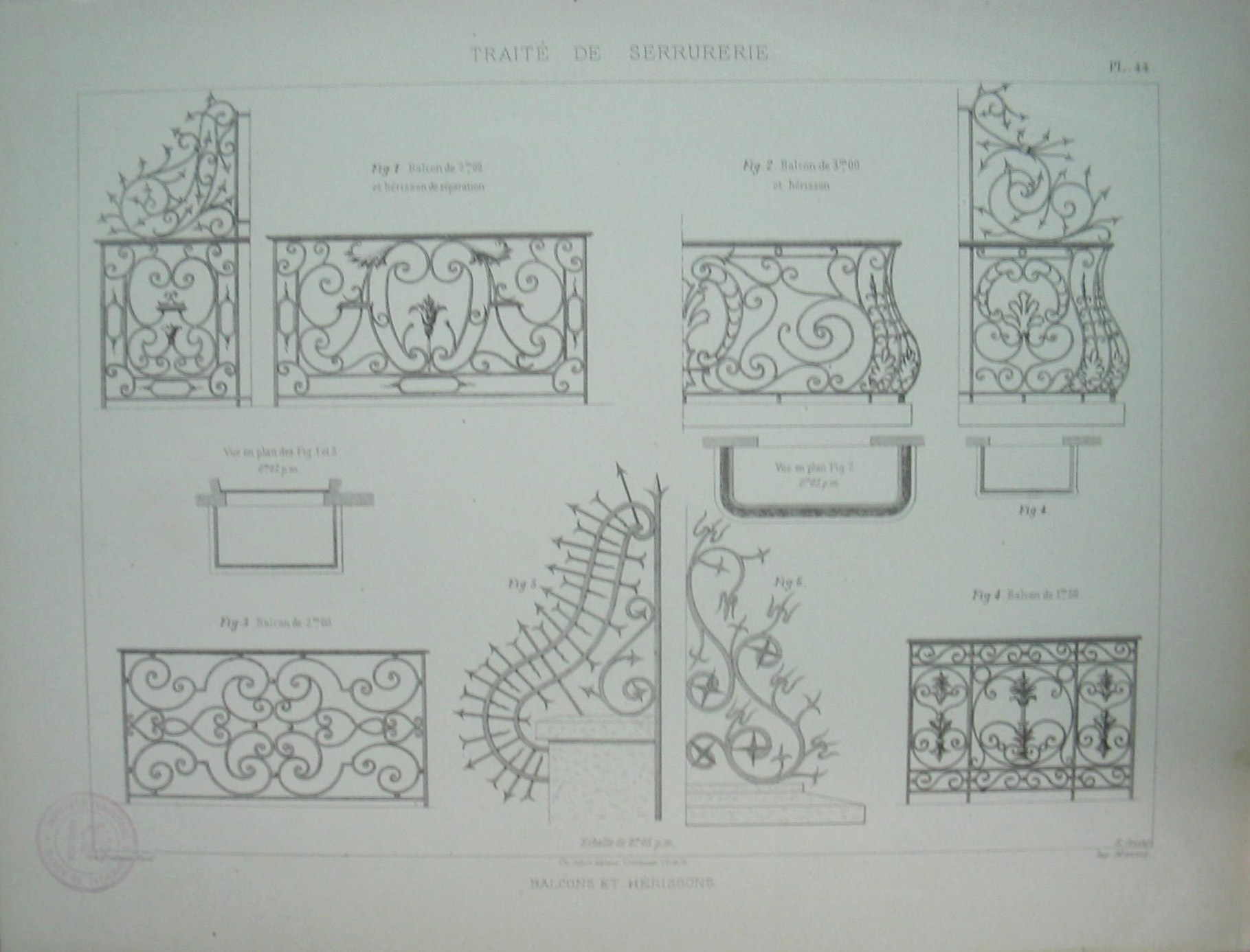 | Descrição: | Estampa PL. 44, pertencente à colecção: "Traité de Serrurerie". A obra completa forma um atlas com 112 estampas. A estampa representa seis figuras com grades de balcões ou varandas, assim como ornamentos em forma de "S" com espetos por todo, denominados ouriços. Estas estruturas são em ferro decoradas com motivos ondulares e vegetais (folhas de acanto). As figuras números 1 e 2 representam balcões do estilo Luís XIII, bastante ornamentadas. Os balcões são encimados por uma separação com espetos, denominada ouriço, que têm como função a protecção e separação de duas paredes ou habitações. As figuras 3 e 4 representam balcões ou varandas direitos, ornamentados com uma decoração simples (linhas onduladas e "S"e motivos vegetais). As figuras 5 e 6 representam ouriços colocados sobre pilastras para proteger a passagem de intrusos. Os corpos dos ouriços têm a forma de "S" envoltos com lanças, espetos e garfos de satanás. |