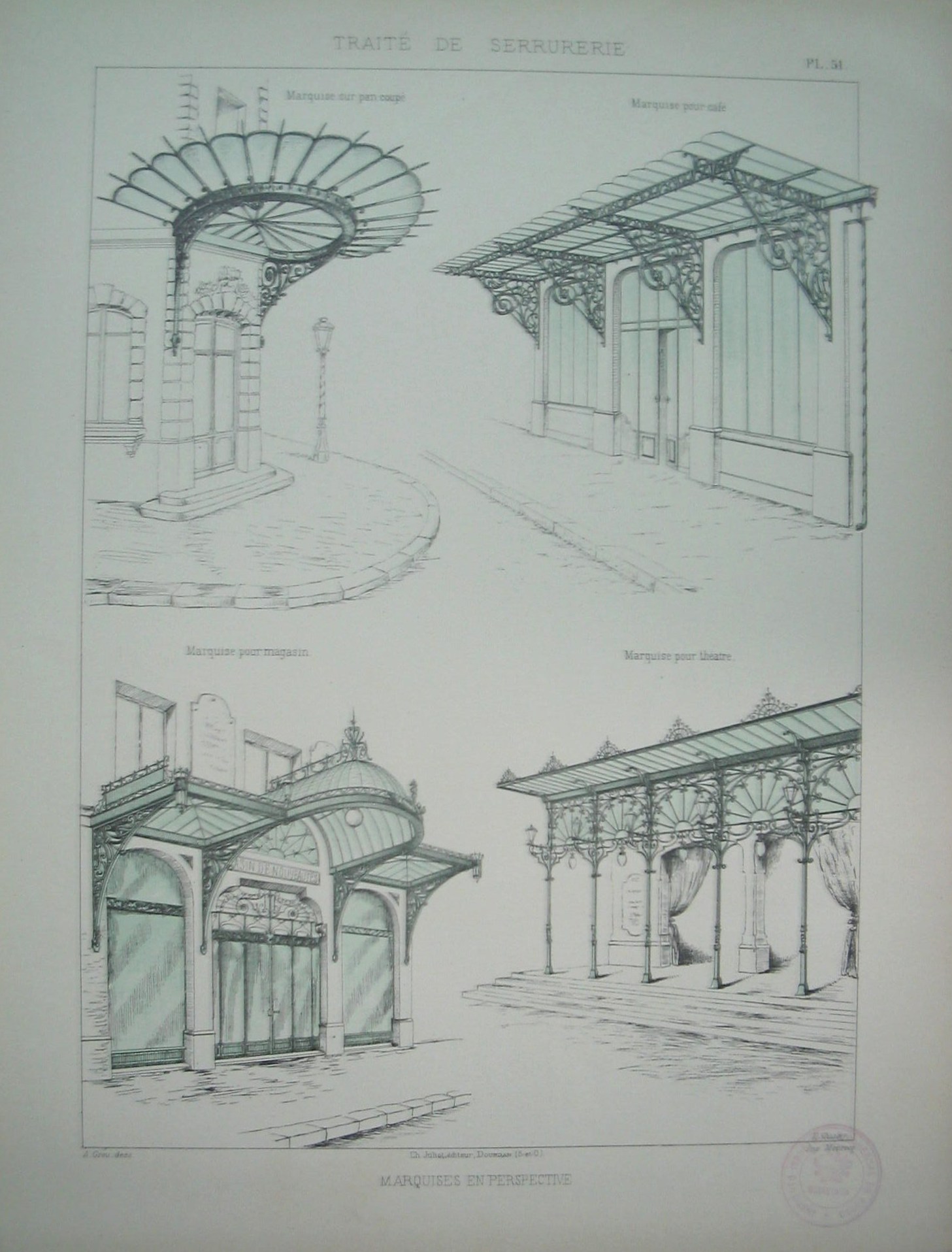 | Descrição: | Estampa PL.51, pertencente à colecção:"Traité de Serrurerie". A obra completa forma um atlas com 112 estampas. Esta estampa apresenta quatro figuras com diferentes alpendres, designadamente, alpendre semi-circular ou em leque, alpendre para café, para loja comercial e para teatro. Estes alpendres possuem construções elaboradas com formas artisticas e decorativas. Geralmente, localizam-se em edificios com lojas comerciais e teatros. Esta construção é constituida por vidro e ferro, onde se salienta os apliques e lambrequins que embeleza a fachada dos edificios. |