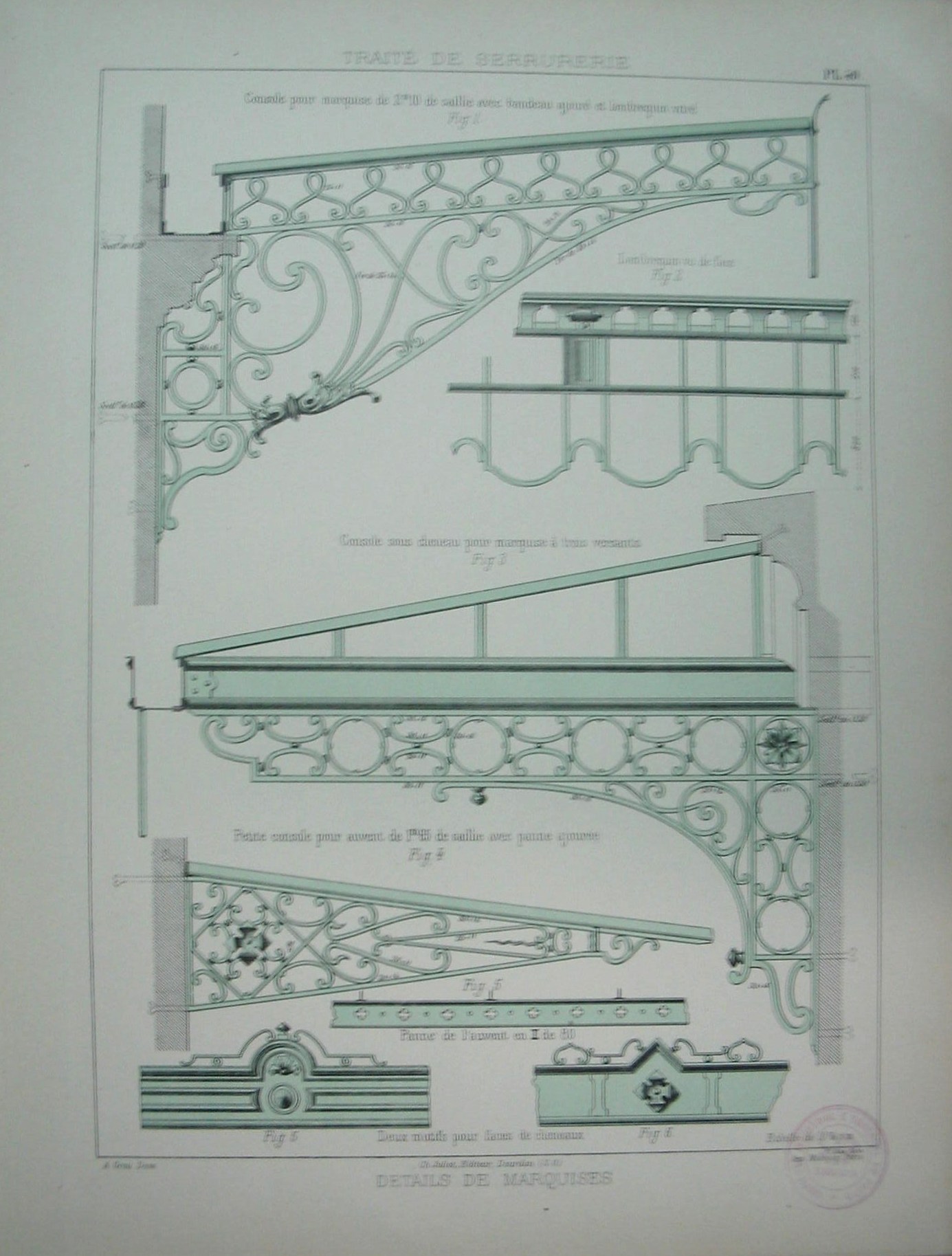 | Descrição: | Estampa PL.49, pertencente à colecção: "Traité de Serrurerie". A obra completa forma um atlas com 112 estampas. A estampa representa três tipos de consolas de alpendres. Na figura 1 a consola está fixada numa parede. Na figura três corresponde a um alpendre fixada nas bordas externas da parede. A figura 4 representa um pequeno coberto. As figuras 2, 5 e 6 representam detalhes que constituem o coberto. Este tipo de construções tinham como finalidade a protecção das entradas dos edificios. Na sua construção utilizam ferro, moldado com efeitos ondulados. |