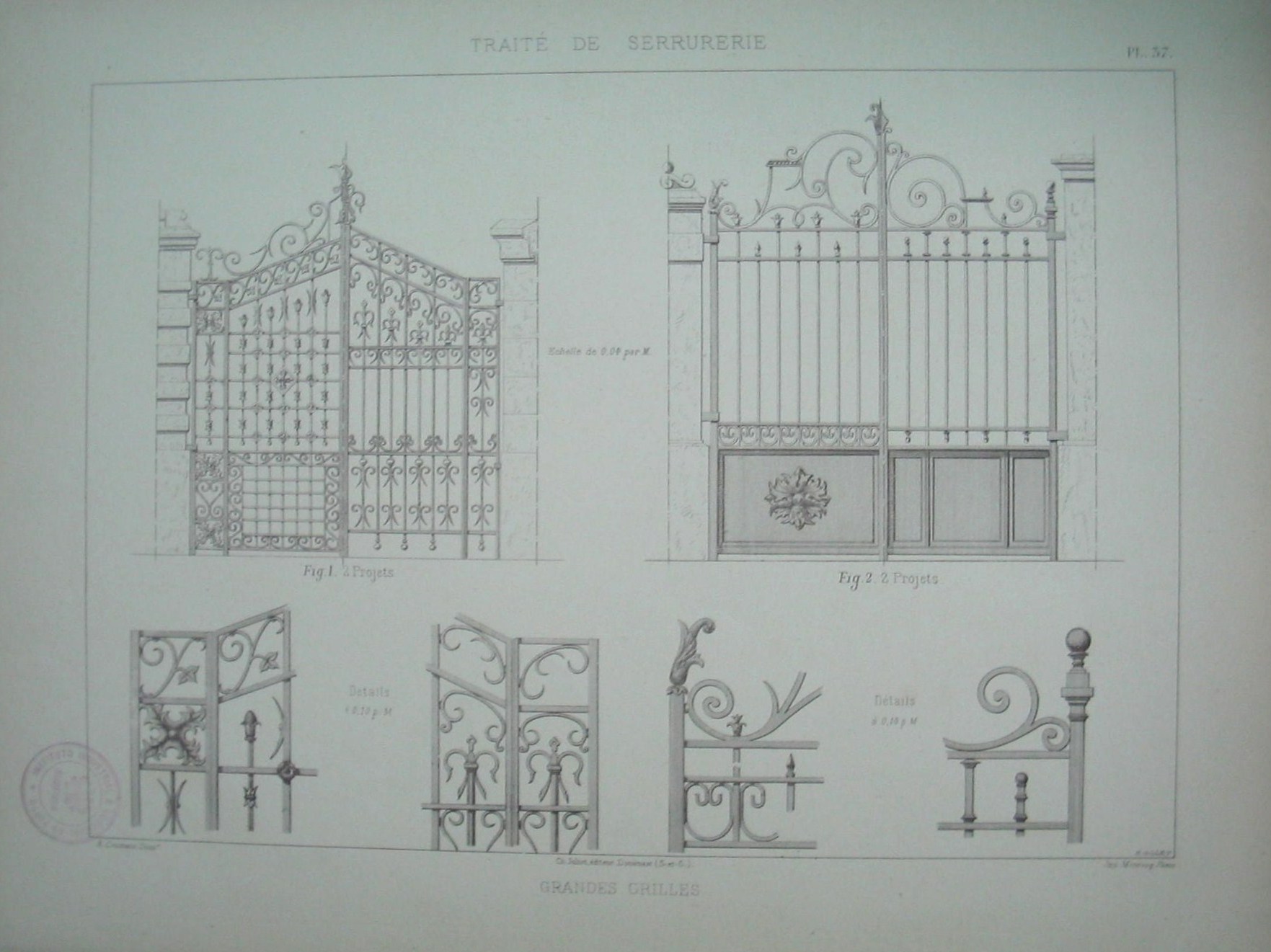 | Descrição: | Estampa PL.37, pertencente à colecção:"Traité de Serrurerie". A obra completa forma 1 atlas de 112 estampas. A estampa representa seis figuras, duas com portões em ferro e quatro com detalhes dos portões. A figura 1 representa um modelo de portão, bastante elaborado. Possui barras verticais com e sem adornos. Nas barras decoradas possuem motivos vegetais (Folhas), arabescos, pinhas e ornamentos em "C". Contém um friso ornamentado com "C"de onde bortam folhas. A figura 2 representa um portão mais simples que o anterior. Na parte inferior possui um painel metálico, com uma roseta. As barras verticais são simples e terminam com pontas de lanças, bolas e chamas. Na extremidade superior contém arabescos. As restantes figuras representam detalhes da estrutura dos portões. As figuras 1 e 2 foram desenhadas à escala de 0,04 m. As figuras dos detalhes foram desenhadas à escala de 0,10 m. |