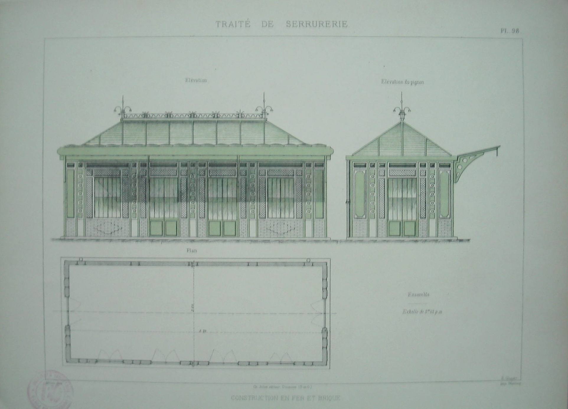 | Descrição: | Estampa PL. 98 pertencente à colecção "Traité de Serrurerie". A obra completa forma um atlas com 112 estampas. A estampa representa a construção de uma habitação, construida em ferro e tijolo. A estrutura é em ferro e o preenchimento é feito em tijolo e telhas cerâmicas. Obtém-se um conjunto com grande resistência e com um aspecto elegante. A estampa apresenta a edificação completa, um pormenor e a planta. A estampa PL. 99 faz parte da mesma construção, representando a estrutura do edificio . |