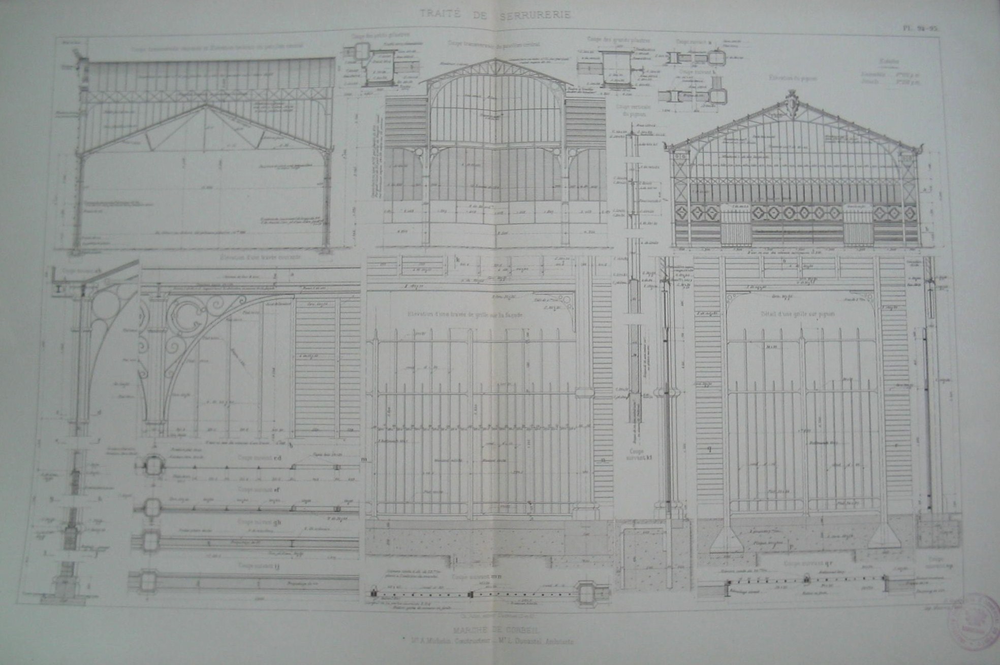 | Descrição: | Estampa PL. 94-95, pertencente à colecção"Traité de Serrurerie". A obra completa forma um atlas com 112 estampas. A estampa representa o mercado de "Corbeil". Apresenta a estrutura do pavilhão central, a elevação lateral e o corte transversal do mesmo e exibe a disposição das janelas, assim como outros detalhes. Toda a estrutura do pavilhão é construido em ferro, com referência para as grades sobre as fachadas. A estampa contém várias figuras com detalhes do mercado. |