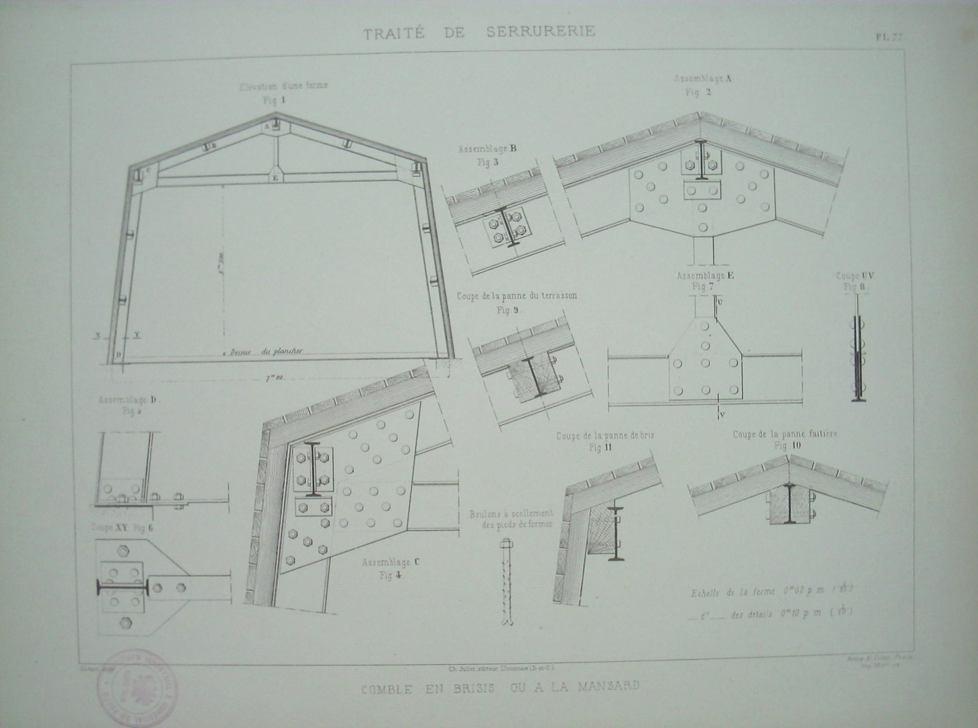 | Descrição: | PL. 77 pertencente à colecção: "Traité de Serrurerie". A obra completa forma um atlas com 112 estampas. Os sotãos são construidos, geralmente, em prédios, castelos, monumentos públicos. O sotão tem a vantagem de possuir um espaço amplo, o que permite instalar várias divisões e de armazenamento de bens. A estampa representa uma estrutura do sotão. É composta por ferros de duplo T e vigas em madeira que são aparafusadas na estrutura. A estampa possui várias figuras com detalhes da estrutura. |