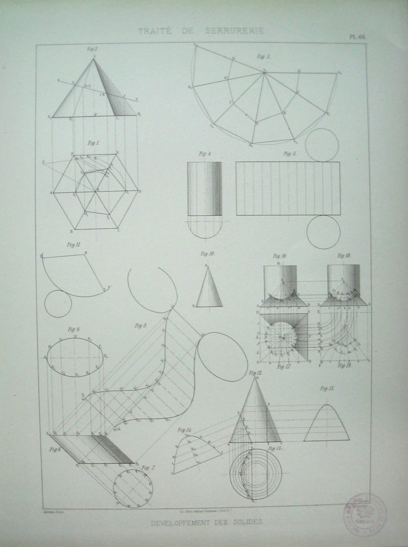 | Descrição: | Estampa PL.66, pertencente à colecção: "Traité de Serrurerie". A obra completa forma um atlas com 112 estampas. A estampa apresenta dezoito figuras com detalhes das projecções dos sólidos, onde se destacam os cones e os cilindros. As figuras representam cones direitos com base poligonal regular (figs. 1 a 3), cilindros direitos (figs. 4 e 5), cilindros obliquos (figs. 6 a 9), cone direito (figs 10 a 15) e a intersecção de um cilindro e um cone com base quadrangular (fig.16 a 18). |