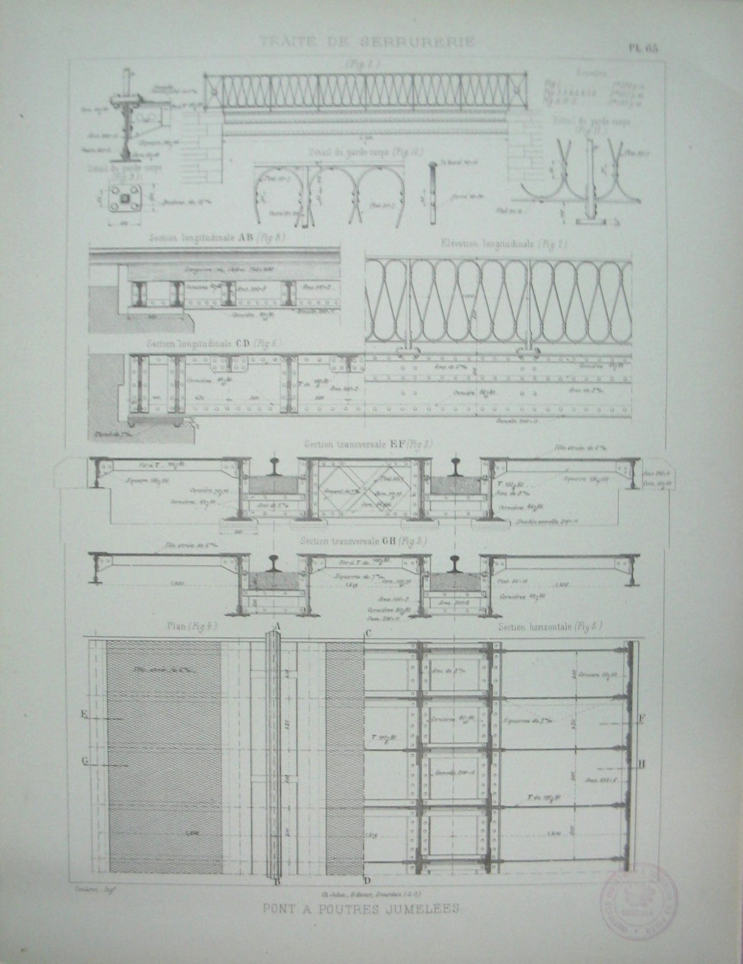 | Descrição: | Estampa PL. 65 pertencente à colecção: "Traité de Serrurerie". A obra completa forma um atlas com 112 estampas. A estampa representa uma ponte de vigas geminadas de 6 metros de abertura para um único canal. A comprimento total do tabuleiro metálico é de 6,800 metros e a largura entre os trilhos de guarda é de 4,520m. Cada feixe geminado é formado com dois duplos T de 511 de altura. A estampa apresenta várias figuras com detalhes da ponte. |