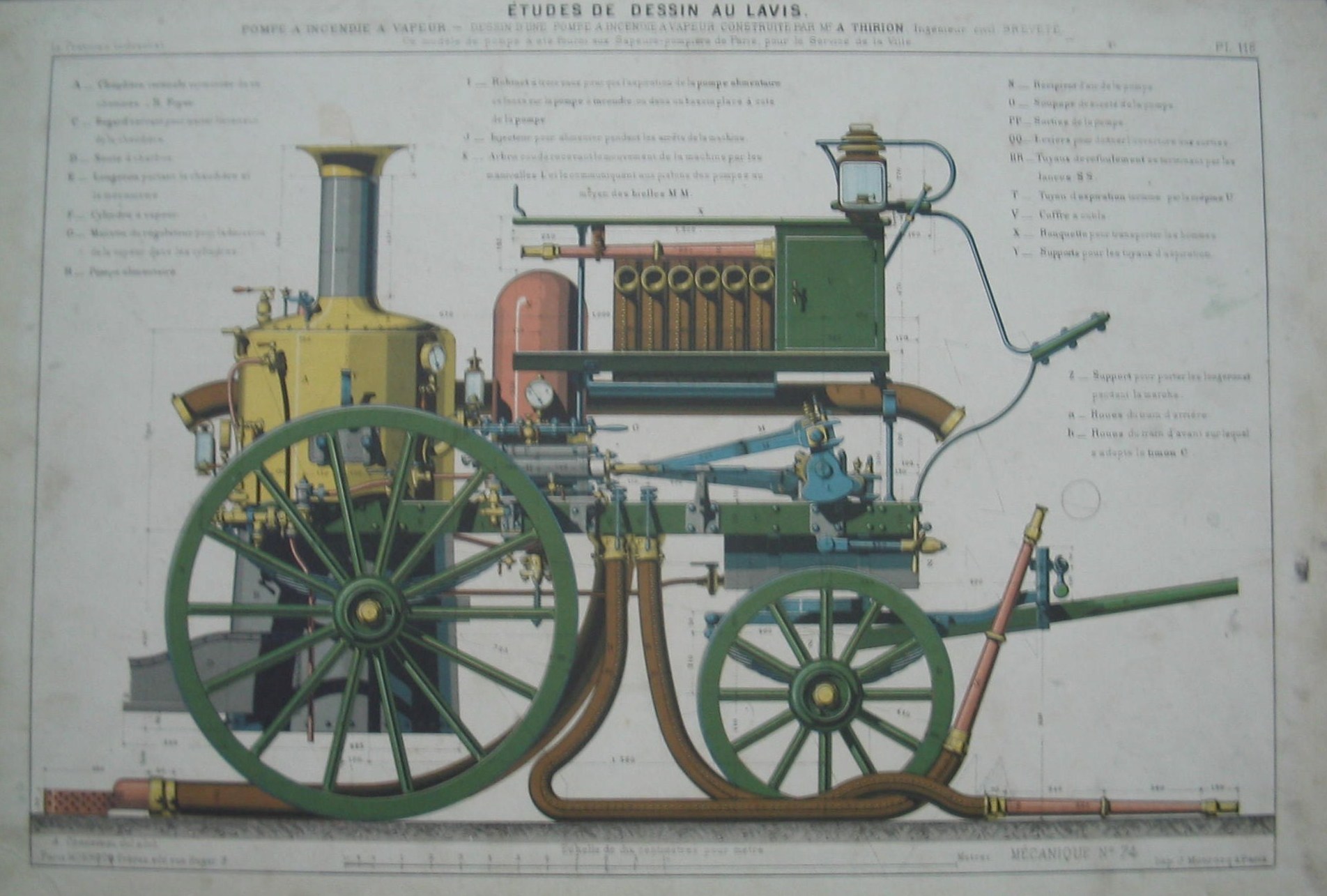 | Descrição: | Desenho de uma bomba de incêndio a vapor, construída pelo Engenheiro Civil A. Thirion, Breveté. Esta bomba foi fornecida pelos bombeiros de Paris, para o serviço da cidade. A estampa contém legenda com a descrição dos componentes da bomba. Estampa PL. 116 pertencente à colecção: "Le Praticien Industriel". Contém o título de: Ètudes de Dessin Au Lavis. Mecânica n. 74. |