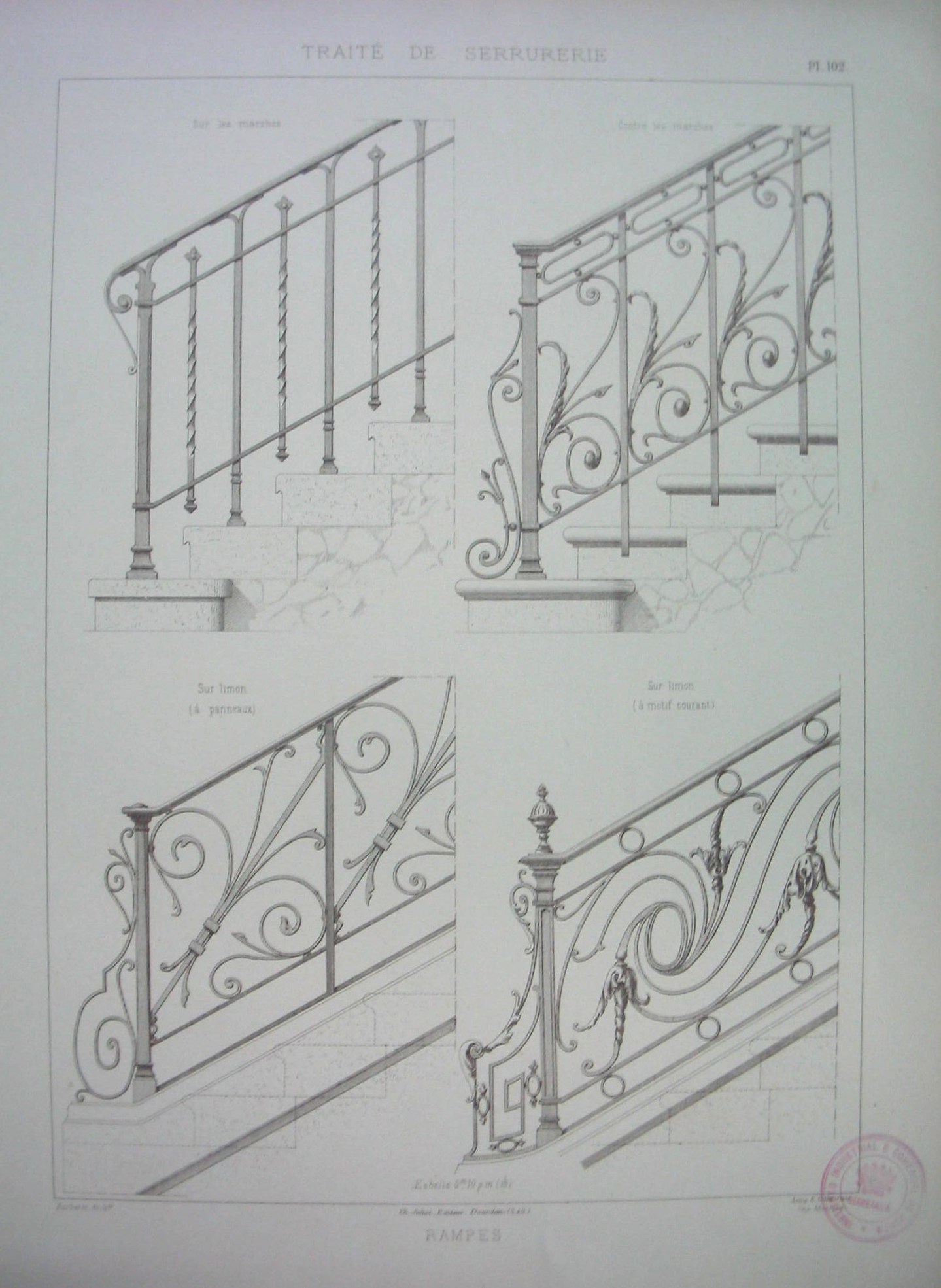 | Descrição: | Estampa PL.102 representa quatro rampas com diferentes modelos de grades. As rampas têm geralmente a altura de 1 metro. Podem ser designadas por rampas francesas ou inglesas, dependendo de como são colocadas, sobre o guarda-chapim ou fixas sobre os degraus. A estampa representa duas rampas de cada estilo. O gradeamento das rampas é em ferro com motivos decorativos, onde predominam elementos vegetais (folhas) e elementos curvos. A estampa pertence à colecção "Traité de Serrurerie". A obra completa forma um atlas com 112 estampas. |