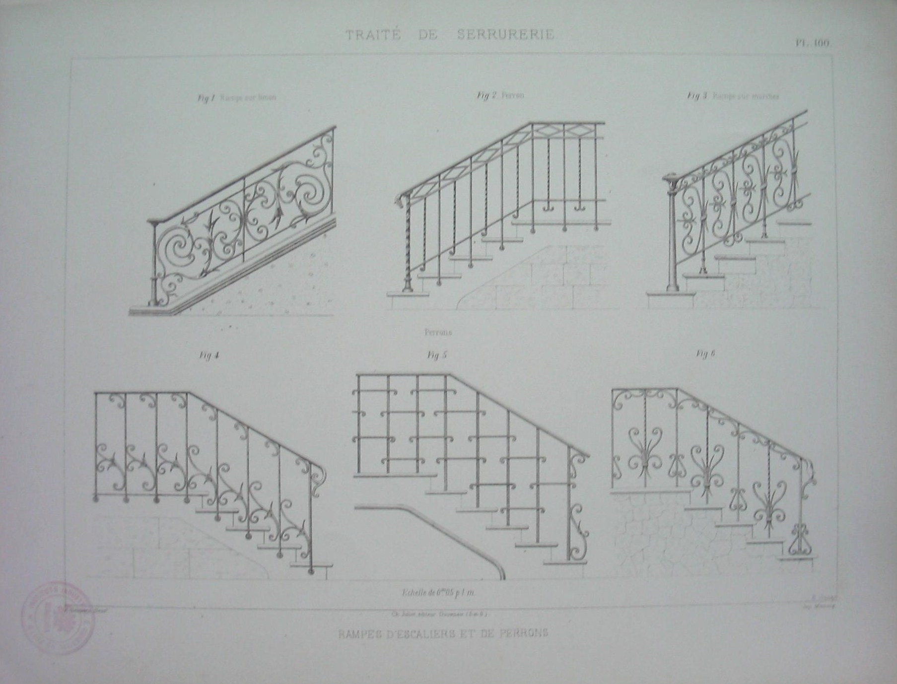 | Descrição: | Rampas de Escadarias. Estampa PL.100 pertencente à colecção "Traité de Serrurerie".A obra completa forma um atlas com 112 estampas. Esta estampa apresenta seis figuras com diferentes modelos de rampas. As rampas e o seu gradeamento são em ferro, decoradas com linhas onduladas, rectas e geométricas. As figuras apresentam rampas que estão fixas sobre as escadas e na parte lateral delas. A rampa da figura 1 está sobre o guarda-chapim. |