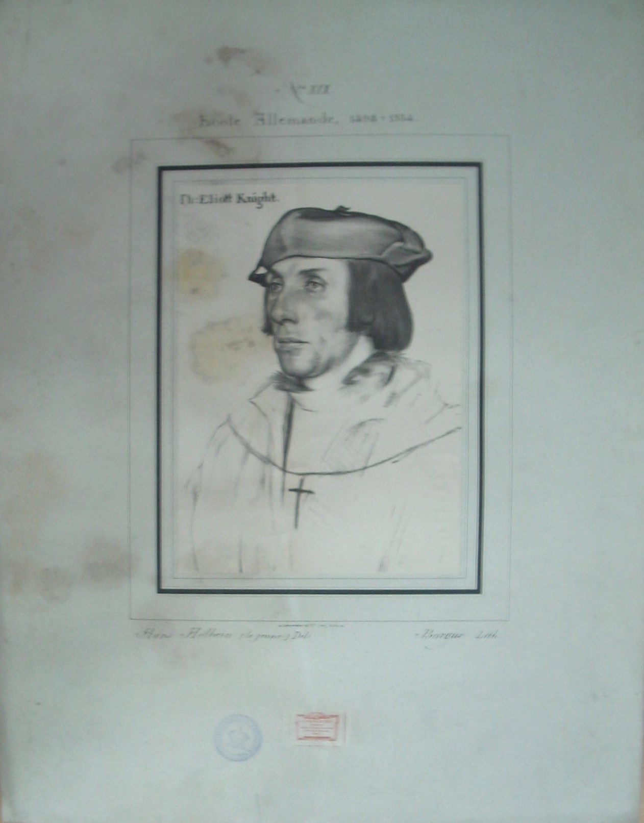 | Observações: | N. XIX Ecole Allemande, 1498+1554. Hans Holbein (le Jeune) Del. Bargue Lith. Lemmercier et C.ie Imp. Paris. Contém o carimbo pertencente à 17ª Cadeira do Instituto Industrial e Comercial do Porto em vigor entre 1886 a 1918. A 17ª Cadeira era dividida em 3 partes, nomeadamente: 1ª parte: Desenho Linear e de Ornato; 2ª Parte:Desenho de figura e de paisagem do natural; 3ª Parte: Modelação; |
