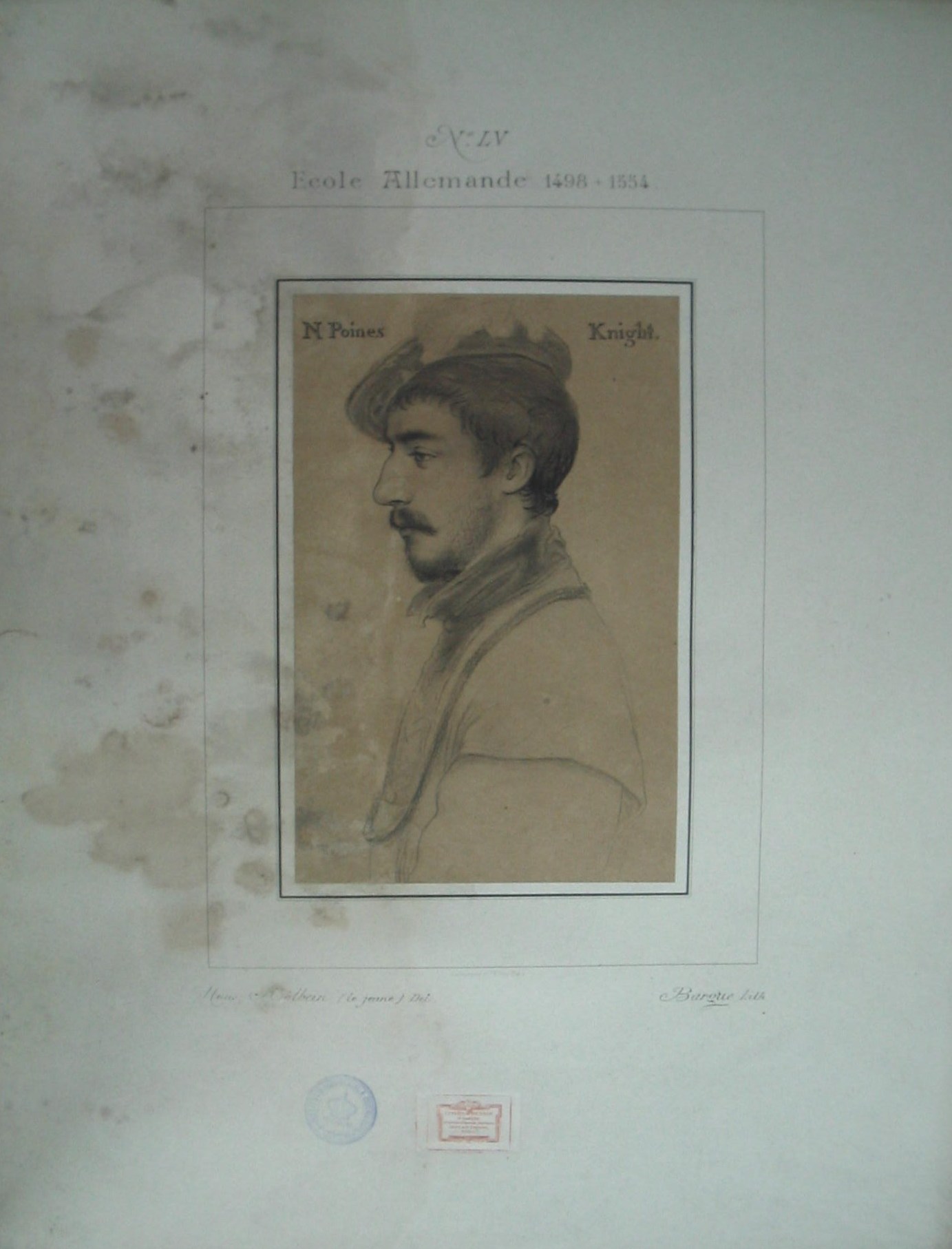 | Descrição: | Estampa representa o retrato de N. Poines Knight. Estampa N. LV - Ecole Allemande 1498 + 1554; A estampa possui o carimbo:"Cours de Dessin - II Partie - Modeles D'Aprés les Maitres". - Goupil & C.ie, Editeurs, Paris. |