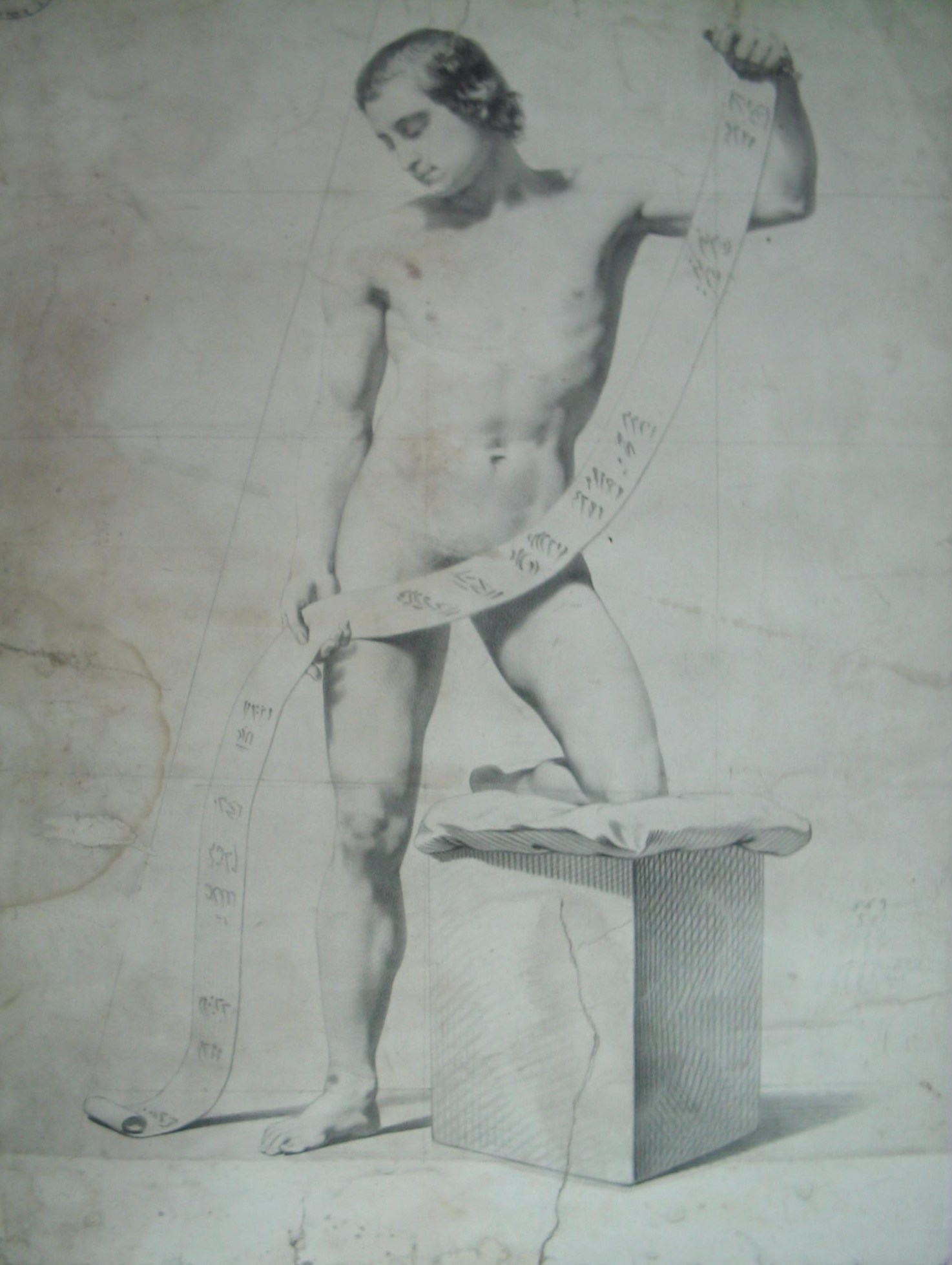 | Descrição: | A estampa representa um homem nú, apoiado com o joelho direito num bloco e com um pergaminho desenrolado. |