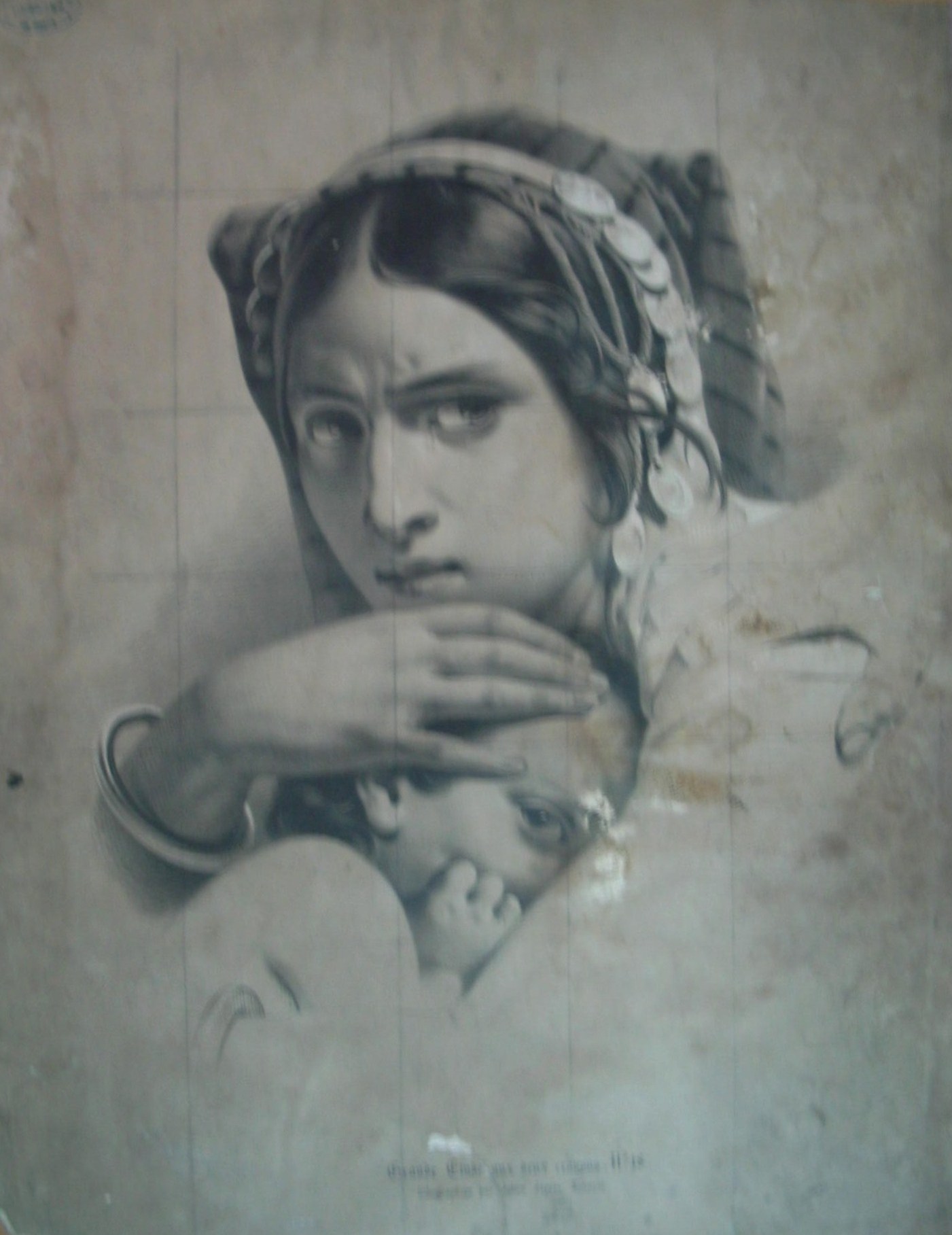 | Descrição: | A estampa representa uma imagem de uma jovem mulher com um bébé ao colo, com uma demonstração de protecção. Sobre o seu ombro direito tem uma mão a agarrar. A jovem tem uma lágrima no olho direito e está com uma expressão de dor. Estampa N. 18 - Grande Etude aux deux crayons. |