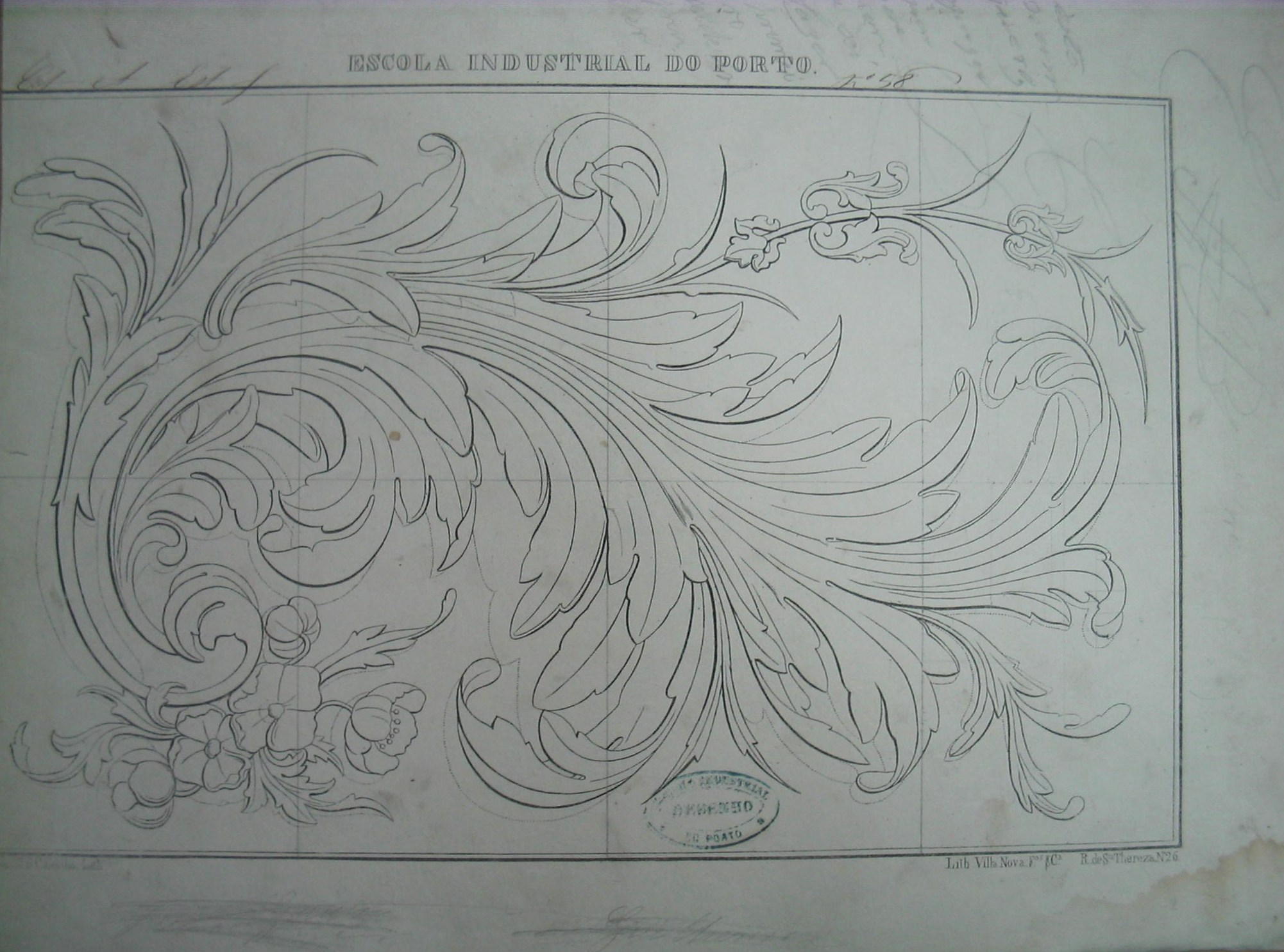 | Descrição: | A estampa representa uma figura composta por folhas de acanto e flores. Na parte superior da estampa contém, a letras maiúsculas,o nome da Escola Industrial do Porto. Ao lado contém a seguinte inscrição:"Col A; Est.f; Nº. 58;" |