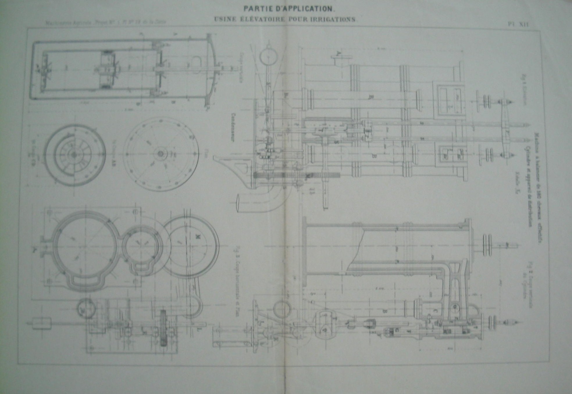 | Descrição: | Estampa PL.XII A estampa representa a máquina oscilante de 180 cavalos, o cilindro e aparelho de distribuição. A estampa faz parte da colecção: Estação elevatória para irrigação; Máquina Agricola-Projecto Nº1, Pl Nº12 de la Sèrie. A estampa contém três figuras. A fig. 1 representa o condensador; A fig. 2 representa o corte vertical do cilindro. A fig. 3 representa cortes vertical e horizontal e planos. |