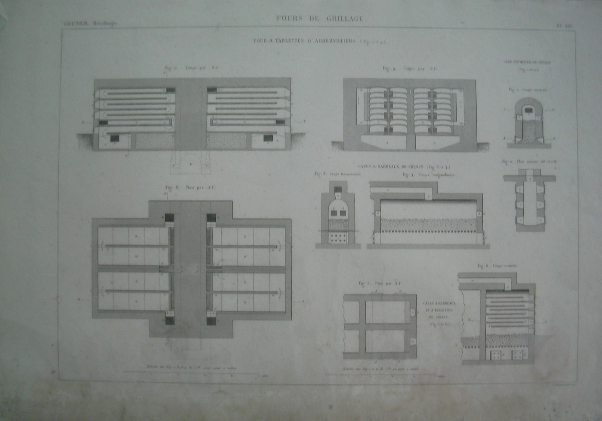 | Descrição: | PL. XXI A estampa representa nove figuras de cortes e planos de fornos de prateleiras de AUBERVILLIERS. As figuras 1 e 2 representam corte vertical e plano de caixa primitiva de CHESSY. As figuras 3 e 4 representam caixas de barras de CHESSY. As figuras 5 e 6 representam caixas de barras e prateleiras de CHESSY. As figuras 7, 8 e 9 representam cortes de secções. |