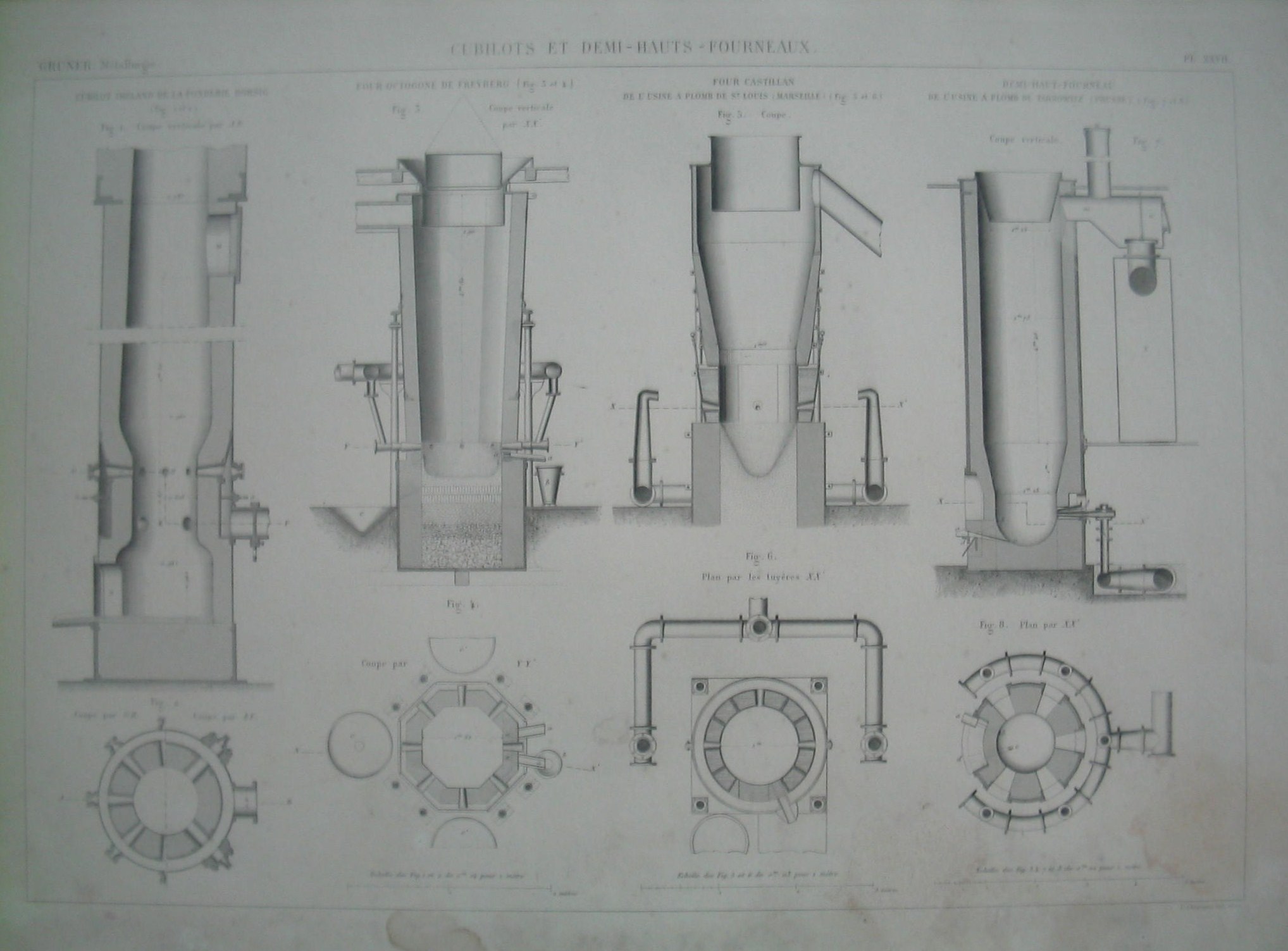 | Descrição: | PL. XXVII A estampa contém oito figuras que representam as fornalhas e meios-fornos para tratamento de minerais. A figura 1 representa o corte vertical da fornalha Irlanda da fundição BORSIG. A fig. 2 representa o corte transversal da Secção GH e EF relativos à figura 1. As figuras 3 e 4 representam, respectivamente, o corte vertical e transversal do forno octógono de FREYBERG. As figuras 5 e 6 representam o corte dum forno castelhano de uma oficina de chumbo de St. Luis (Marselha) e o plano da secção XX' dos alcaraviz (bicos) do forno. A figura 7 e 8 representam o corte vertical e o plano XX' dos meios fornos de uma fábrica de chumbo de TARNOWITZ (Prússia). |