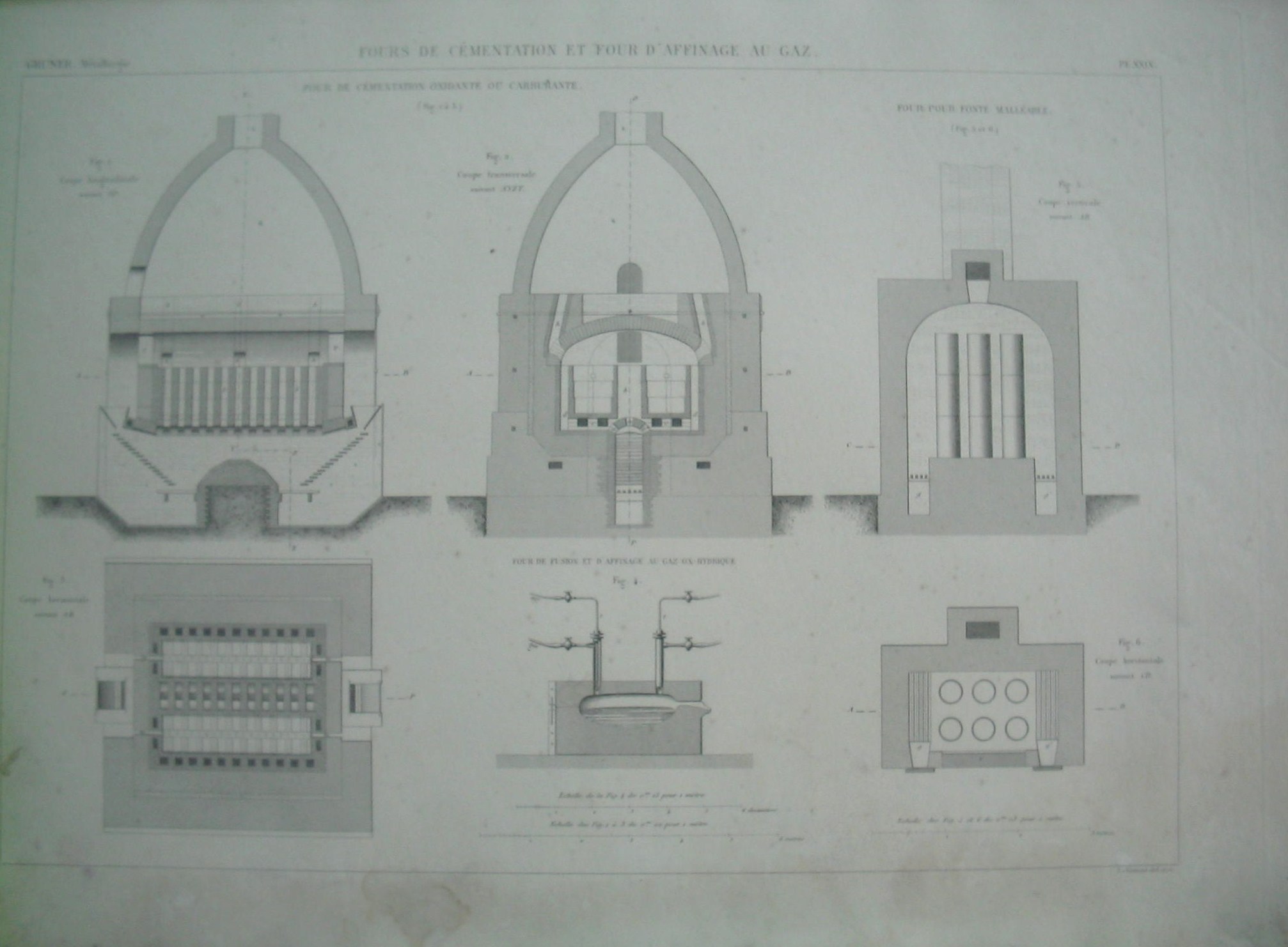 | Observações: | PL. XXIX GRUNER. Mètallurgie L.Chaumont del st sc. Catálogo on-line: Biblioteca Nacional de França; (www.bnf.fr) Traité de Mètallurgie, Parte 1, Tome 2; par L.M. Gruner (1875-1878). Este volume (segundo) é dividido em duas partes, onde compreende o estudo de todos os procedimentos metalúrgicos, especialmente o aquecimento, a torrefação, refino e redução. |