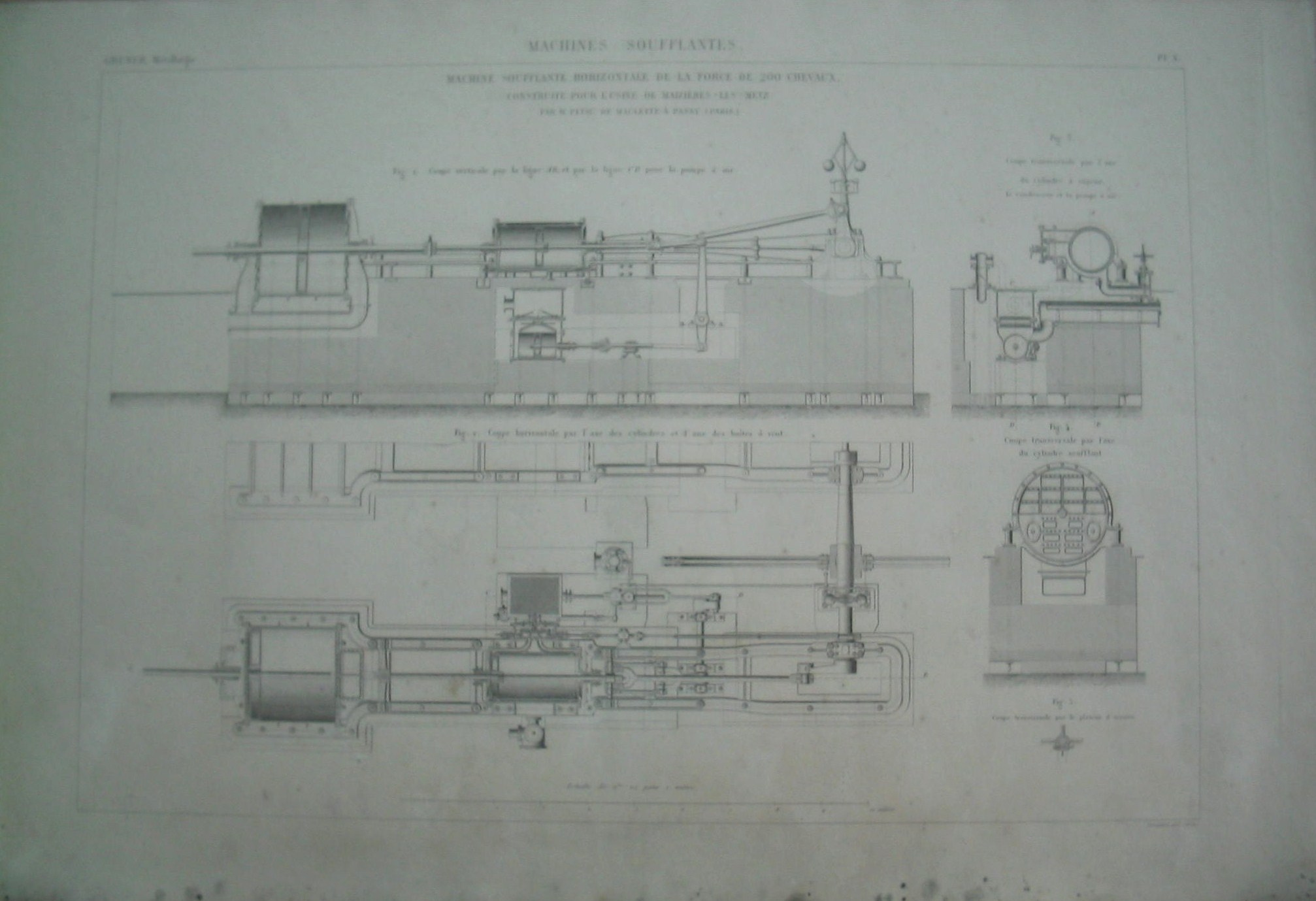 | Descrição: | PL.X A estampa representa cinco imagens com cortes da máquina ventiladora horizontal de 200 cv de força. Esta máquina foi construida para a oficina de MAIZIÈRES-LES-METZ, por M.PETAU DE MAULETTE À PASSY (PARIS). Possui uma única roda/volante colocada entre os quadros de dois cilindros. As figuras 1 e 2 representam, respectivamente um corte vertical (linhas AB e CD da bomba de ar) e um corte horizontal do eixo dos cilindros e duma caixa de ar. A figura 3 representa um corte transversal do eixo do cilindro a vapor, o condensador e a bomba de ar. A figura 4 representa um corte transversal do eixo do cilindro ventilador. A figura 5 representa o corte transversal da placa de chegada. |