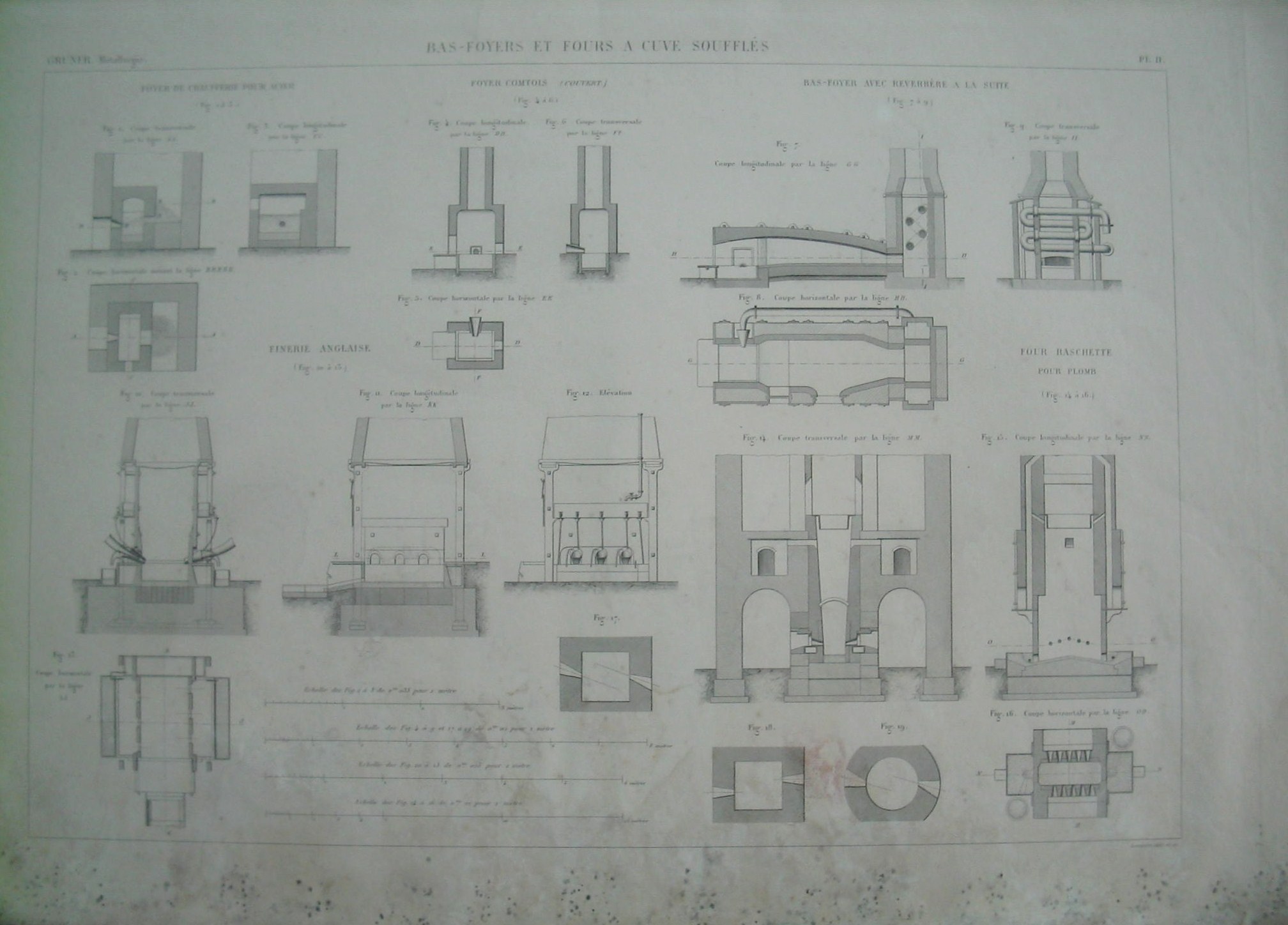 | Descrição: | PL.II A estampa contém dezanove imagens relativas a pequenos fornos. As figuras 1 à 3 representam cortes tranversal da linha AA, horizontal -Linha BBBB e longitudinal - linha CC dum forno de forja para aço e ferro. Estes fornos são constituidos por uma caixa de tijolos refractários colocados numa hotte tal como os fornos comuns. As chamas e os fumos saem por um orificio que serve em simultâneo para entrada (das barras para fundir). As figuras 4 à 6 representam cortes longitudinal-linha DD, horizontal linha EE e transversal -linha FF do forno coberto COMTOIS. Este forno coberto tem apenas um alcaraviz, onde se refina o ferro fundido e o carvão vegetal pelo processo COMTOIS ou alemão. Possui duas portas. Uma (direita) serve para o carregamento para a fusão e a outra (esq), mais alta e mais larga que a anterior, para o trabalho de fundição e para o carregamento do carvão e acessórios. As figuras 7 à 9 representam cortes longitudinal, horizontal e transversal do baixo-forno reverberatório. O forno possui um aparelho em forma de serpentina, para distribuição do calor. As figuras 10 a 13 representam o corte longitudinal da linha KK, a elevação e o plano do forno Inglês. As figuras 14 à 16 representam cortes transversal da linha MM, longitudinal da linha NN e horizontal da linha OO do forno RASCHETTE para tratamento do chumbo. As figuras 17,18 e 19 representam a disposição dos bicos dos fornos de tanque, de modo que os jactos de vento não impliquem o seu desempenho. |