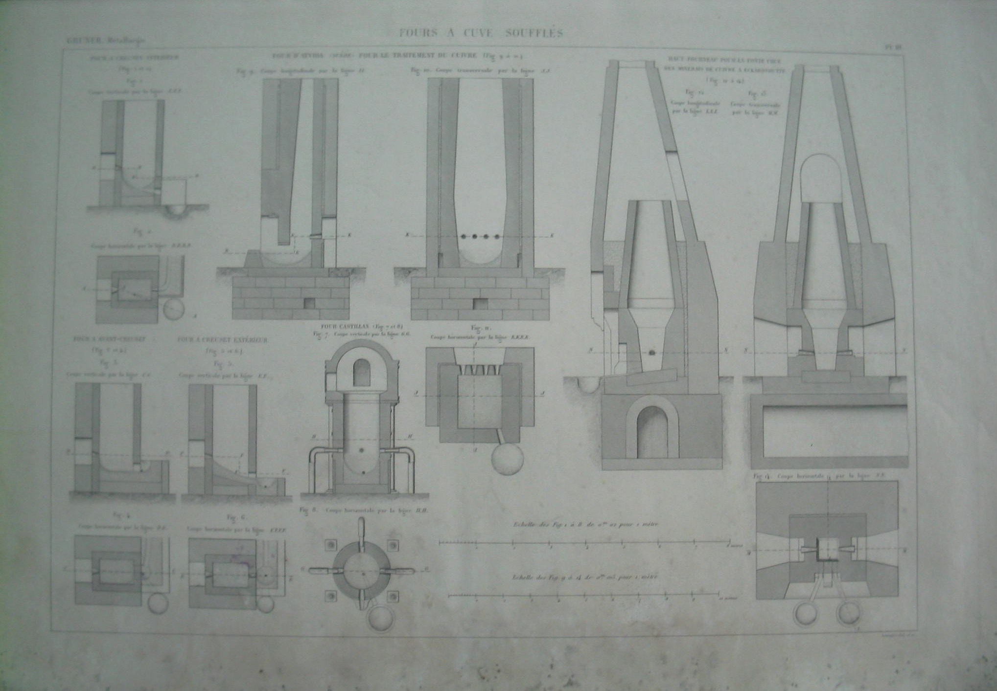 | Descrição: | PL. III A estampa contém catorze imagens com cortes e planos de fornos tanque para metais. As figuras 1 e 2 representam corte vertical da linha AAA e o corte horizontal da linha B,B,B,B do forno com cadinho interior e de secção rectângular. As figuras 3 e 4 representam um corte vertical da linha CC e um corte horizontal da linha DD do forno com cadinho montado dentro e fora do forno. As figuras 5 e 6 representam corte vertical da linha E,E e o corte horizontal da linha E,E,E,F do forno com cadinho exterior. As figuras 7 e 8 representam o corte vertical da linha GG e o corte horizontal da linha HH do forno CASTILLAN (castelhano). Este forno era utilizado para a fusão dos minerais cobre e chumbo. As figuras 9 à 11 representam cortes longitudinal, transversal e horizontal do forno D'ATVIDA (Suécia-para tratamento do cobre). Estes fornos são de meia altura, de secção rectângular, onde se faz o derretimento dos minerais piritosos. As figuras 12 à 14 representam cortes longitudinal, transversal e horizontal do alto forno ECKARDSHüTTE para a fundição dos minerais de cobre. Este forno possui o tanque interior em forma cilindrica. |