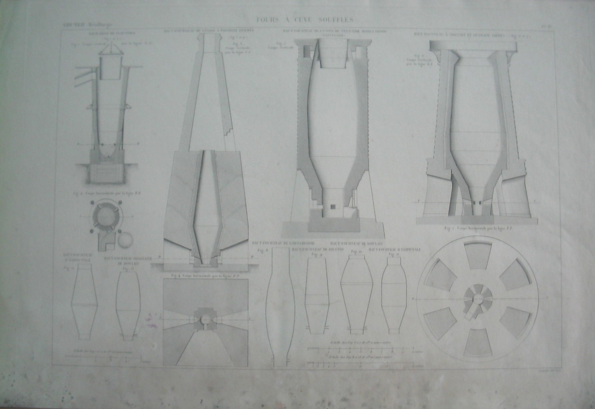 | Descrição: | PL. IV A estampa contém treze imagens com cortes de secções relativos a fornos de tanque. As figuras 1 e 2 representam o corte vertical da linha A,A e o corte horizontal da linha BB do forno redondo . Este forno é um alto forno, de secção circular onde se trata os minerais plumbosos, pelo método de precipitação, na fábrica de Clausthal, em Hartz. As figuras 3 e 4 representam cortes vertical e horizontal do alto forno de Stryrie ( Alpes) de porta fechada, sem abertura propriamente dita. Este forno serve para o tratamento de minerais espáticos manganesiferos para obtenção de carvão vegetal. A figura 5 representa um corte vertical dum alto forno de fábrica de TEES-SIDE MIDDLESBORD (CLEVELAND). O tanque do forno possui a forma cilindrica, assim como o exterior do forno. Este é uma estrutura maciça,constituido por ferro e suportada por quatro pilares. As figuras 6 e 7 representam o corte vertical e horizontal dum alto forno de cadinho e trabalhos livres. A estrutura é maciça e suportada por seis pilares e por arcos cônicos que ligam-se entre si. A figura 8 representa um alto forno de GARTSHERRIE; A figura 9 representa um alto forno de BILSTON; A figura 10 representa um alto forno de DOWLAIS. A figura 11 representa um alto-forno de EBBW-VALE. A figura 12 representa um alto-forno ordinário de DOWLAIS. A figura 13 representa um alto-forno D'EBBW-VALE. As figuras 8 a 13 representam diversos perfis de altos-fornos ingleses e escoses. |