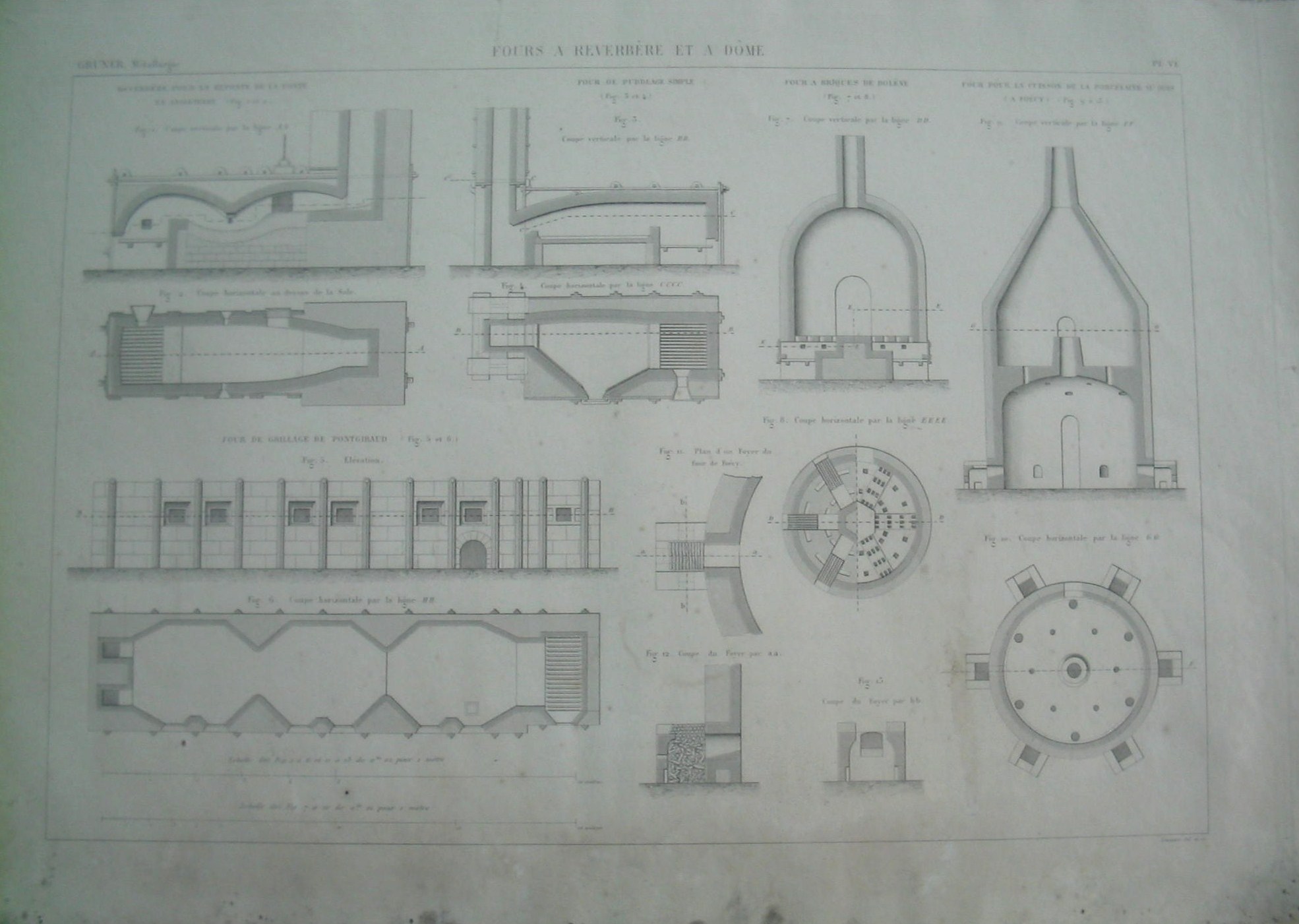| Descrição: | PL. VI. A estampa contém treze imagens com cortes de secções de fornos reverbatórios e de cúpula ou abóbada. As figuras 1 e 2 representam o corte vertical e horizontal do forno reverbatório para fusão do ferro. O forno possuem formas rectângulares com abóbadas duplas. As figuras 3 e 4 representam cortes vertical e horizontal de secções do forno de pudlagem simples. È um reverbatório para a fusão e combustão do ferro. A generatriz das abobadas são paralelas ao eixo do forno. os muros laterais servem de pé-direito à abóbada. As figuras 5 e 6 representam a elevação e o corte horizontal da linha HH do forno de combustão de PONTGIBAUD. Este forno possui vários compartimentos e servem para acombustão de minerais de chumbo. As figuras 7 e 8 representam o corte vertical e horizontal do forno de tijolos de BOLÈNE (Vaucluse). Estes fornos têm a forma de cúpula ou abóbada. Servem para o cozimento de tijolos refractários. As figuras 9 à 13 representam cortes vertical, horizontal de secções do forno de cúpula em madeira para o cozimento de porcelana, em FOECY. Este forno é dividido em dois compartimentos. O inferior serve para o cozimento da porcelana e a superior para o primeiro fogo. |