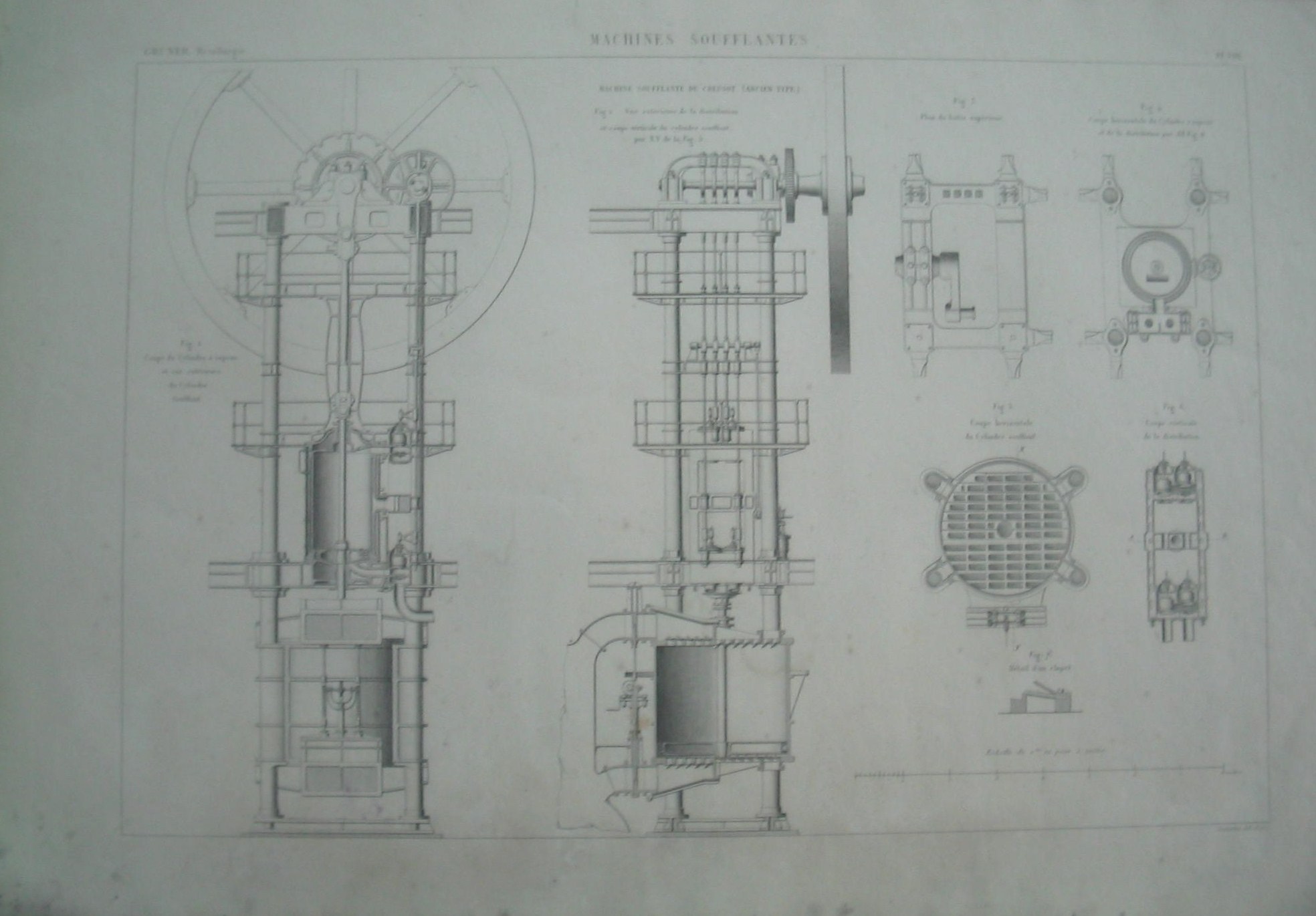 | Descrição: | PL. VIII A estampa possui sete imagens com cortes de secções da máquina ventiladora vertical de Creusot. A máquina é composta por uma torre em alvenaria, bastante sólida, onde são encastradas as vigas metálicas que suportam as diversas partes das máquinas. A figura 1 representa o corte do cilindro a vapor e a vista exterior do cilindro ventilador. A figura 2 representa a vista exterior da distribuição e o corte vertical do cilindro ventilador da linha XY relativa à fig. 5. A figura 3 representa o plano superior dos quadros. A figura 4 representa o corte horizontal do cilindro a vapor e da distribuição -secção AB relativa à fig.6. A figura 5 representa o corte horizontal do cilindro ventilador. A figura 7 representa o corte vertical da distribuição. A figura 7 representa o detalhe duma válvula automática. |