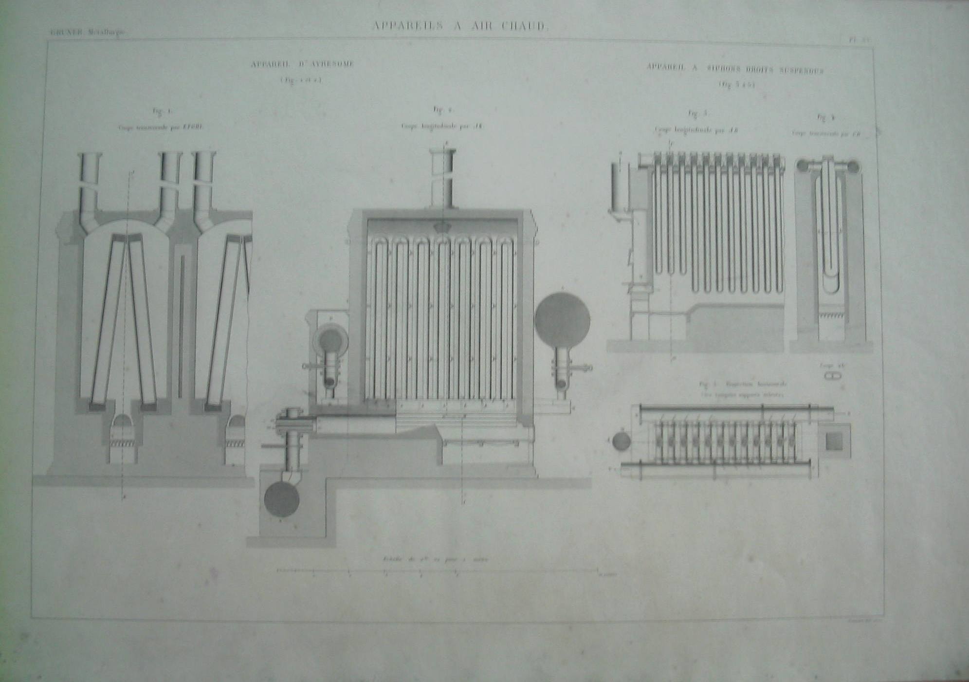 | Descrição: | PL. XV A estampa apresenta cinco figuras com cortes de secções relativos a três aparelhos de ar quente, com serpentina vertical. As figuras 1 e 2 representam o corte transversal e longitudnal do aparelho de ar quente da fábrina de AYRESOME. A imagem da figura 1 representa tubos inclinados e a figura 2 representa um conjunto de tubos verticais em serpentina. Esta figura mostra um duplo modo de aquecimento.Possui dois modos de aquecimento. À direita possui um forno ordinário de grelha e à esquerda um forno alimentado a gás. As figuras 3 à 5 representam cortes longitudinal e transversal e a projecção horizontal do aparelho de sifões direitos suspensos. |