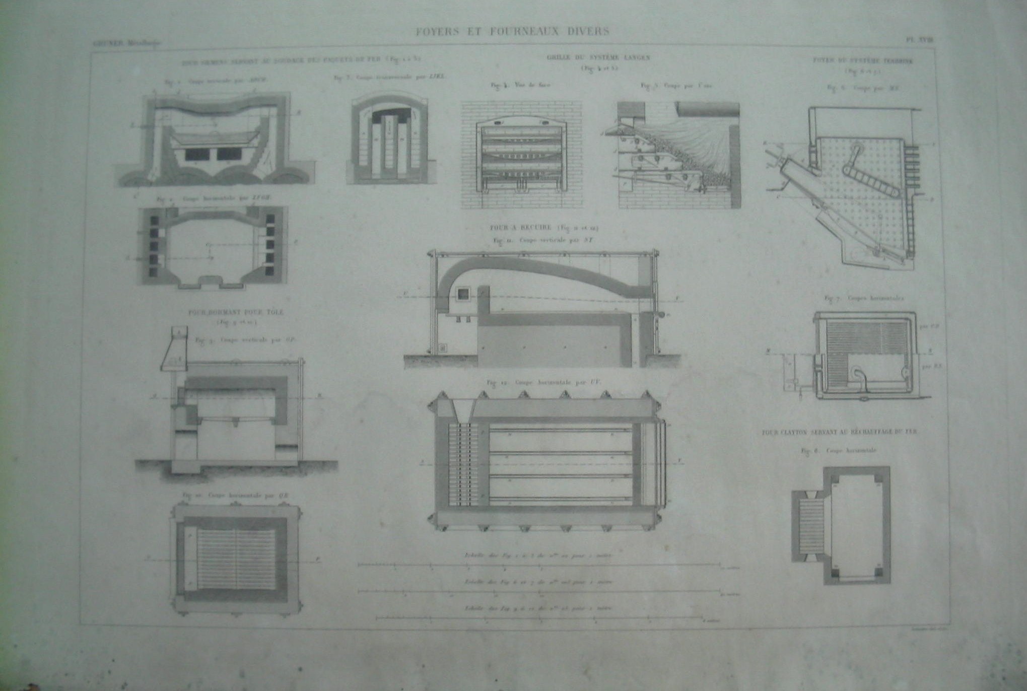 | Descrição: | PL. XVIII A estampa apresenta doze imagens com cortes de secções de diversos fornos e fornalhas. As figuras 1 à 3 representam cortes vertical, horizontal e transversal do forno Siemens para soldagem de pacotes de ferro. O forno contém duas portas, uma delas é entrada e a outra a saída dos pacotes. As figuras 4 e 5 representam a vista frontal e o corte do eixo da grelha do sistema LANGEN. As figuras 6 e 7 representam o corte da secção MN e o corte horizontal do forno de sistema TENBRINK. Este exemplo de forno com a grelha inclinada demonstra a acção recíproca da corrente de ar e da corrente das chamas, devido à acção da caldeira (peça bb). A figura 8 representa o corte horizontal do forno Clayton utilizado para o reaquecimento do ferro.As figuras 9 e 10 representam o corte vertical da secção OP e o corte horizontal da secção QR do forno dormente para chapa. Este forno é constituido por uma simples barra para aquecimento, onde se coloca o combustível e sobre este, as chapas de ferro. A tiragem é baixa, porque não possui chaminé, propriamente dita. O fumo escapa para o exterior pela abertura do carregamento (pp'). As figuras 11 e 12 representam o corte vertical e o horizontal do forno de recozimento. Este forno distingue-se pelas disposições especiais utilizadas para evitar a oxidação das chapas de ferro. |