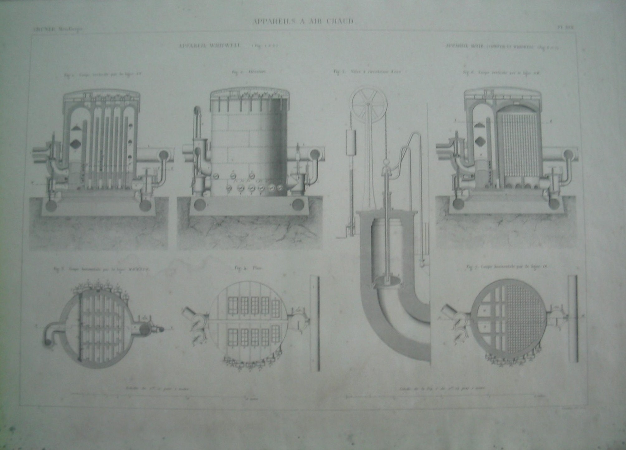 | Descrição: | PL. XVII A estampa contém sete imagens com cortes de secções do aparelho de ar quente. As figuras 1 à 5 representam cortes de secção do aparelho simples WHITWELL. A figura 1 representa o corte vertical da linha XY; a figura 2 representa a elevação; a figura 3 representa o corte horizontal da linha MM'M''NPQ; a figura 4 representa o plano e a figura 5 representa a válvula de circulação de água. O aparelho é composto por uma torre em folha de chapa à prova de água, revestido, por tijolos refractários. As figuras 6 e 7 representam o corte vertical da linha GH e o corte horizontal da linha IK do aparelho misto COWPER e WHITWELL. |