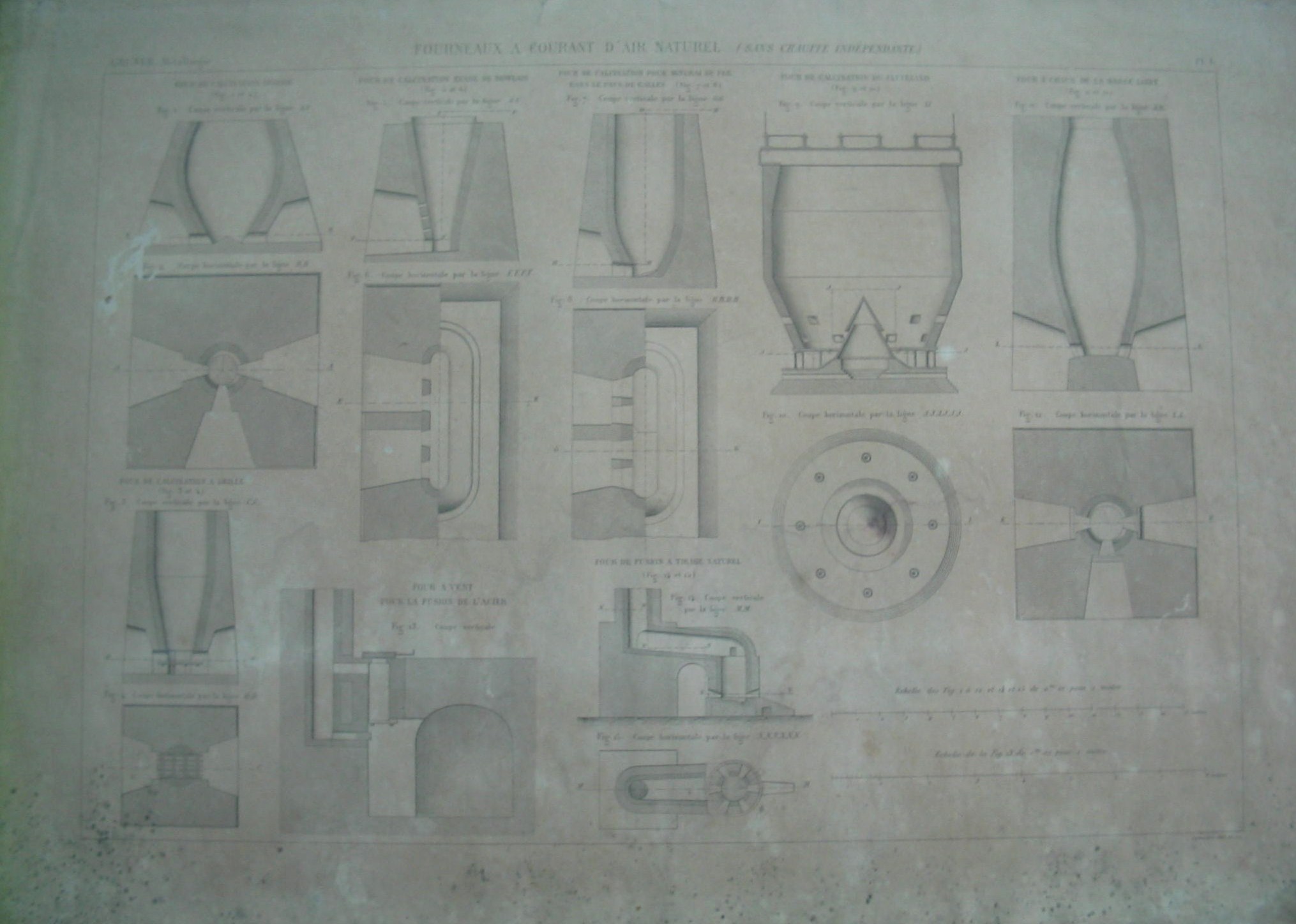 | Descrição: | PL. I A estampa contém quinze imagens com cortes de secções e planos dos fornos de fluxo de ar natural sem aquecimento independente. As figuras 1 e 2 representam cortes vertical e horizontal da linhas A,A e B,B respectivamente, do forno ovalde calcinação. Este forno era utilizado para o cozimento do cálcario em pedra ou a calcinação dos minerais de ferro e da calamina. As figuras 3 e 4 representam o corte vertical (linha C,C) e o corte horizontal (linha D,D) do forno de calcinação de grelha; Este forno possui uma grelha em barras de ferro, que garantem melhor a distribuição do ar e separa as cinzas dos fragmentos mais grossos. As figuras 5 e 6 representam o corte vertical e horizontal do forno aberto de calcinação de DOWLAIS. As figuras 7 e 8 representam o corte vertical da linha G,G e o corte horizontal da linha H,H,H,H do forno de calcinação para minerais de ferro, no país de Galles. As figuras 9 e 10 representam o corte vertcal da linha I,I e o corte horizontal da linha J,J,J,J,J,J do forno de calcinação de CLEVELAND. As figuras 11 e 12 representam o corte vertical da linha K,K e o corte horizontal da linha L,L do forno de cal do baixo LOIRE. A figura 13 representa o corte vertical do forno de vento para a fusão de aço. As figuras 14 e 15 representam o corte vertical da linha M,M e o corte horizontal da linha N,N,N,N,N,N do forno de tiragem natural. Este forno possui uma alta chaminé para a tiragem do fumo. A estampa possui duas escalas relativas às figuras; Uma escala é das figuras 1 à 12, 14 e 15 de 0,01m por 1 metro; A outra escala é relativa à figura 13 de 0,02 m por 1 metro; |