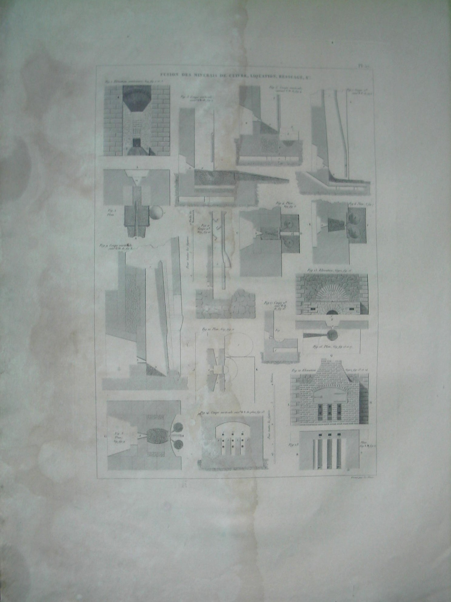 | Descrição: | PL. 57 A estampa contém dezassete imagens relativas à fusão e liquação de minerais de cobre. As figuras representam vários planos, cortes de secção e elvações de fornos de fusão de minerais de cobre. |