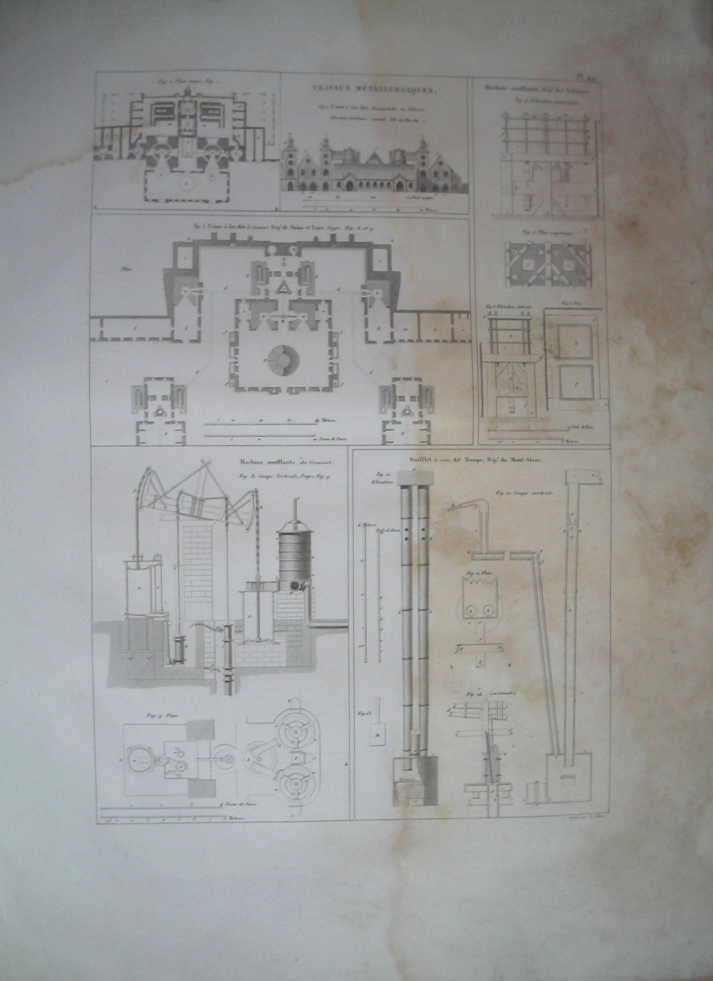 | Descrição: | Estampa PL.49 A estampa contém várias imagens de fábricas de metalúrgia e máquinas. A figura 1 representa a elevação anterior do corte AB, da planta da fig.2, da fabrica de ferro, chamada "Koenigshiitte", na Silésia. A figura 2 representa a planta da fábrica. A figura 3 representa a planta da fábrica de ferro, chamada "Le Creusot", Departamento de Saône e Loire. As figuras 4 à 7 representam a elevação anterior e lateral, o plano superior da máquina ventiladora do departamento de Ardennes. A figura 8 representa o corte vertical da máquina ventiladora de Creusot. A figura 9 representa o plano da mesma. As figuras 10 à 14 representam a elevação, o corte vertical, o plano e detalhes da máquina de água do departamento do Mont-Blanc. |