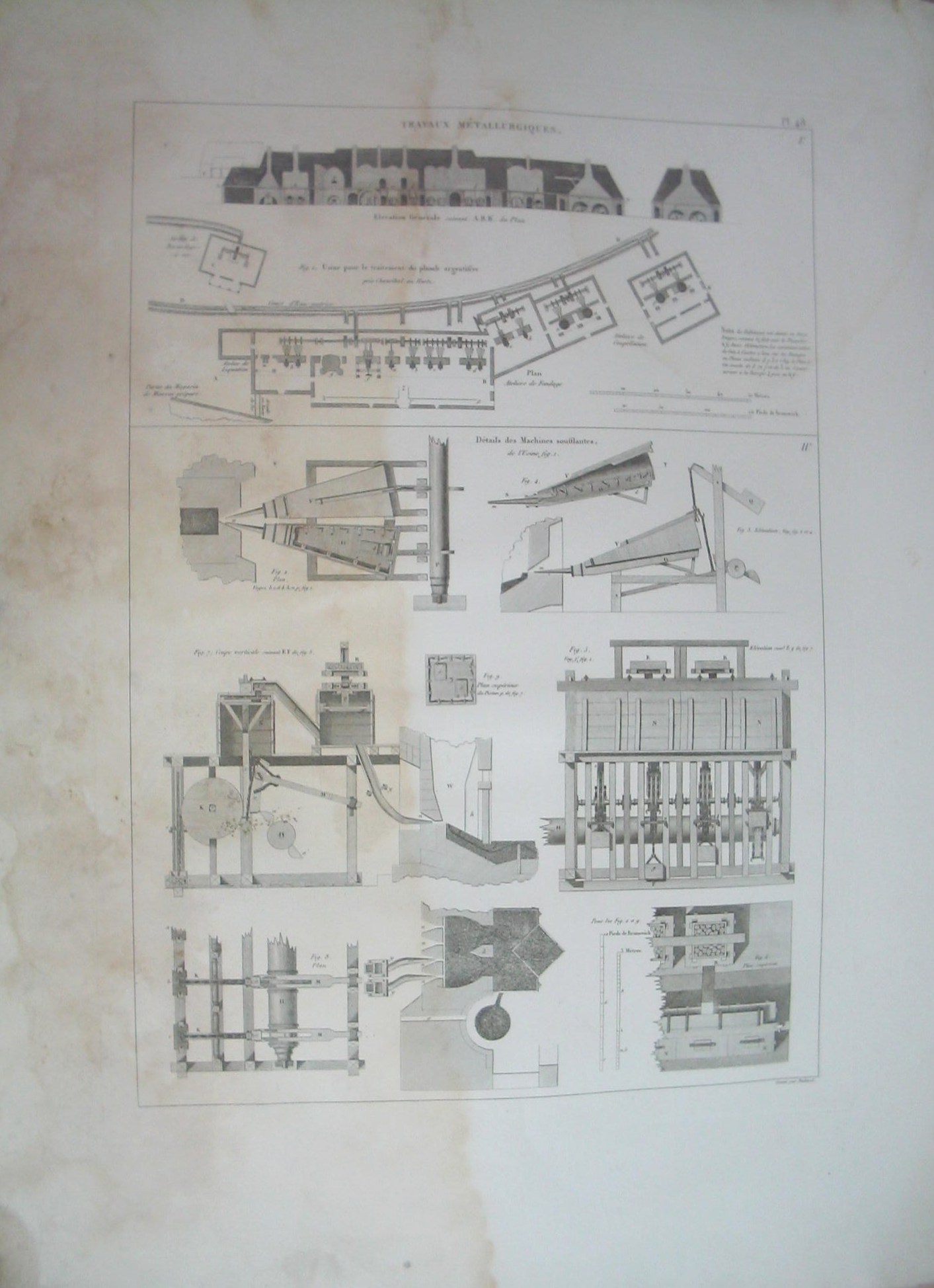 | Descrição: | Estampa PL. 48 A estampa está dividida em duas partes. A primeira parte possui imagens duma fábrica para o tratamento do chumbo argentífero. A segunda parte correspondem oito imagens com detalhes das máquinas ventiladoras da fábrica. A primeira parte corresponde à figura 1 que representa a elevação geral e planta da fábrica para o tratamento do chumbo argentífero, perto de Chausthal, em Hartz. As figuras 2 à 9, pertencentes à segunda parte, representam planos, elevações e cortes de várias secções relativas à máquina ventiladora. |