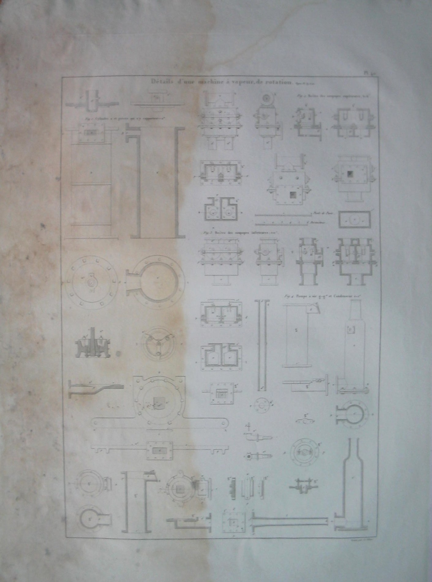 | Descrição: | Estampa PL. 40 A estampa possui vários conjuntos de imagens de detalhes da máquina a vapor de rotação (estampas PL.39 e PL.41). A figura 1 representa o cilindro (a) e peças que reportam à imagem (a''). A figura 2 representa caixas de válvulas superiores das imagens b-b'. A figura 3 representa caixas de válvulas inferiores das imagens c-c7. A figura 4 representa uma bomba de ar (imagens g-g13) e condensador (imagens e-e4). |