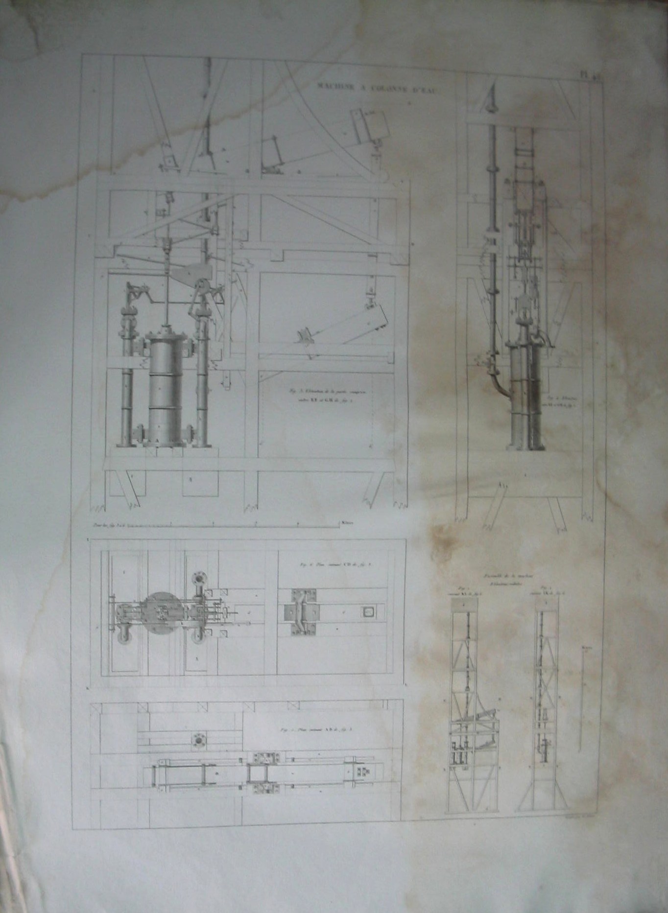 | Descrição: | Estampa PL. 42 A estampa contém seis figuras que representam a máquina com coluna de água, assim como os planos e detalhes da mesma. As figuras 1 e 2 representam um conjunto da máquina de elevação reduzidas, segundo os cortes KL e o corte IK referentes à figura 6. A figura 3 representa a elevação da parte compreendida entre os cortes E,F e GH relativos à figura 1. A figura 4 representa a elevação entre os cortes EF e GH da figura 2. As figuras 5 e 6 representam os planos das secções AB e CD, respectivamente, e relativos à figura 3. |