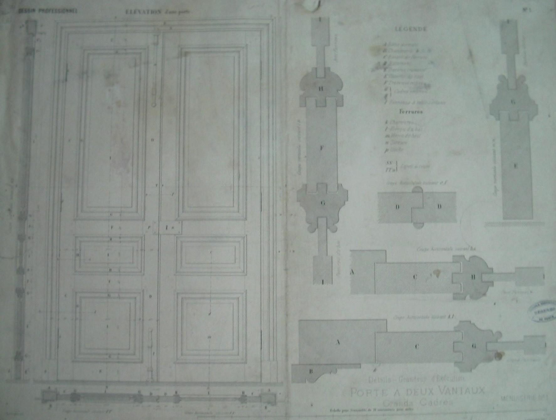 | Descrição: | Estampa N.1 A estampa possui uma imagem da elevação de uma porta com dupla abertura e várias imagens de detalhes da porta, tais como dobradiças, fechaduras, painéis, entre outros. A imagem da dupla porta é representada por grandes painéis na parte superior. A meio e na parte inferior possui pequenos painéis. Na estampa, contém representações de cortes horizontais e verticais de várias secções. O desenho é representado à escala de 18 cm/metro. A estampa pertence à colecção de "Carpintaria" nº1. |