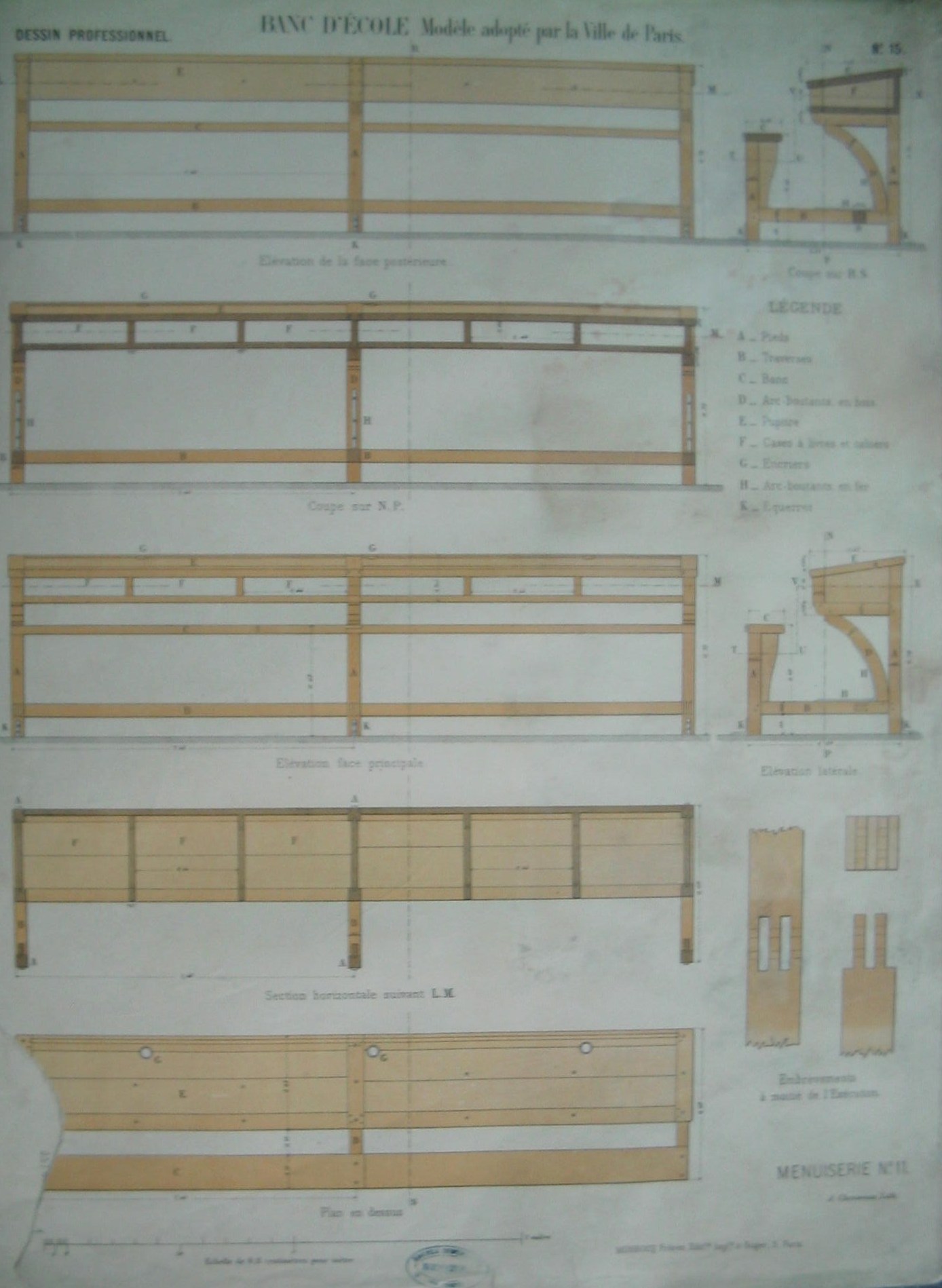 | Descrição: | Estampa Nº 15 - Dessin Professionnel A estampa contém dez imagens de cortes horizontais, verticais e elevações dum banco de escola. Este banco, também, pode-se denominar de carteira escolar. As duas figuras laterais confirmam o formato da carteira escolar. As outras imagens mostram elevações à face posterior, à face principal e cortes horizontais de várias secções. Estas carteiras escolares foram adoptados como modelo para as escolas da cidade de Paris. A estampa pertence à colecção: "Menuiserie N.11". |