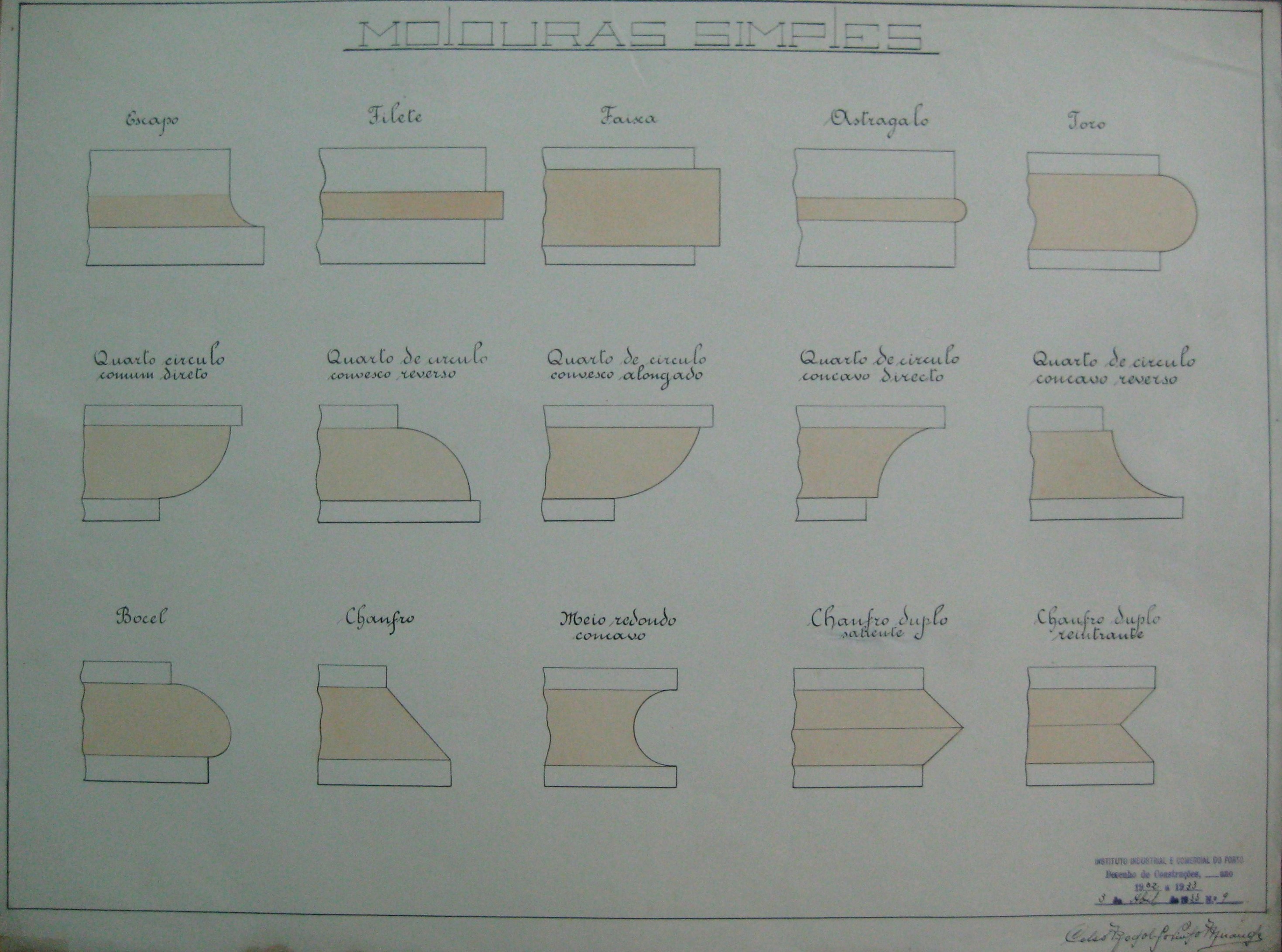 | Descrição: | O trabalho curricular apresenta vários modelos de Moduras Simples, designadamente, Escapo, Filete, Faixa, Astragalo;Toro;Quarto de circulo comum directo, quarto de circulo convexo reverso e quarto de circulo convexo alongado; quarto de circulo côncavo directo e quarto de circulo côncavo reverso; Bocel, Chanfro; Meio redondo côncavo;Chanfro duplo saliente e chanfro duoplo reintrante; |